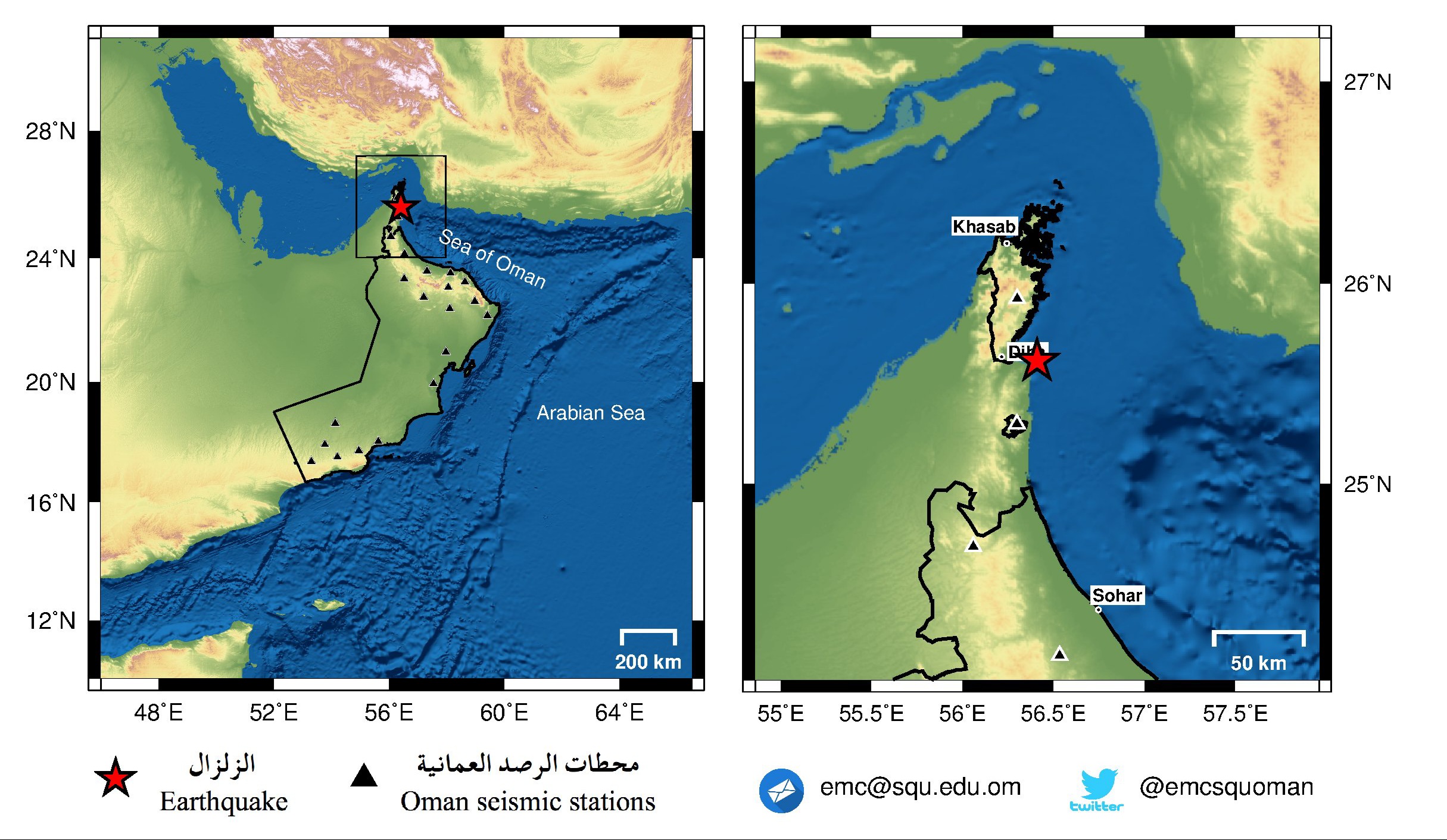 أعلن مركز رصد الزلازل بجامعة السلطان قابوس عن زلزال بقوة ٢٫٩ في بحر عمان س ٤:٥٤ ص بالتوقيت المحلي