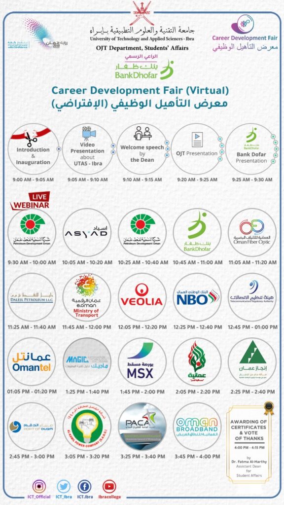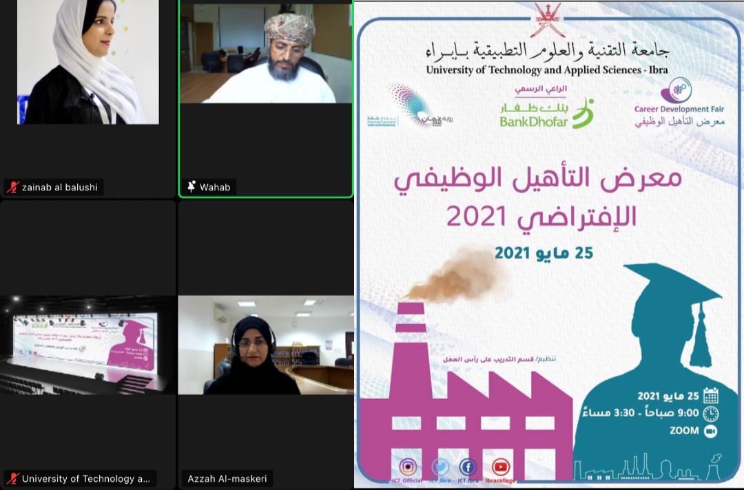 عبر منصة زوم انطلقت صباح امس فعاليات معرض التأهيل الوظيفي بجامعة التقنية و العلوم التطبيقة بابراء بمشاركة اكثر من خمسة و عشرين مؤسسة من القطاع الخاص.