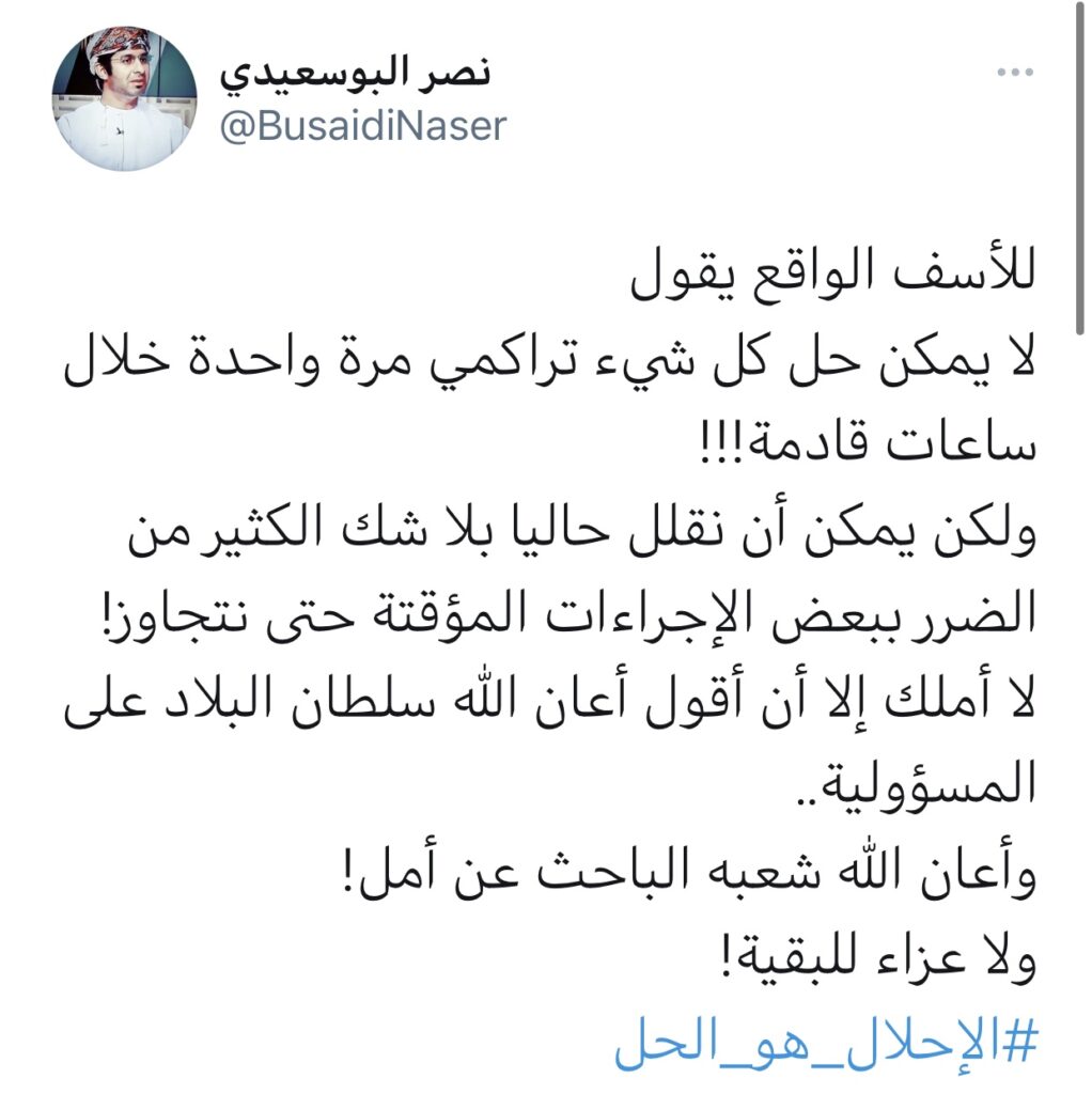 بينما أكد نصر البوسعيدي على أن الحل يكمن في الإحلال حيث قال : للأسف الواقع يقول لايمكن حل كل شي تراكمي مرة واحدة خلال ساعات قادمة! ولكن يمكن أن نقلل حاليا بلا شك الكثير من الضرر ببعض الإجراءات المؤقتة حتى نتجاوز ! لا أملك إلا أن أقول أعان الله سلطان البلاد على المسؤولية .. وأعان شعبه الباحث عن أمل ! ولا عزاء للبقية .