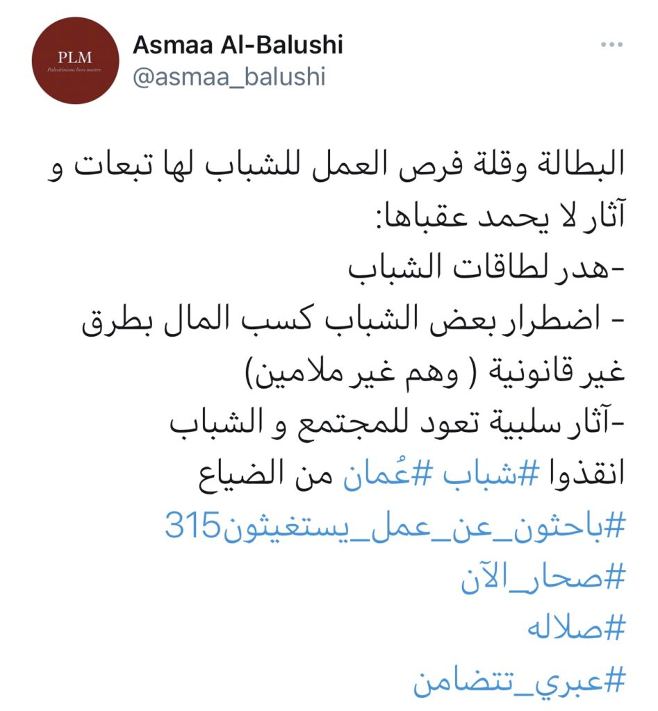 وتناولت أسماء البلوشي في تغريدتها تبعات البطالة قائلة : البطالة وقلة فرص العمل للشباب لها تبعات وآثار لا يحمد عقباها : هدر لطاقات الشباب. اضطرار بعض الشباب كسب الحال بطرق غير قانونية ( وهم غير ملامين ) . آثار سلبية تعود للمجتمع والشباب.