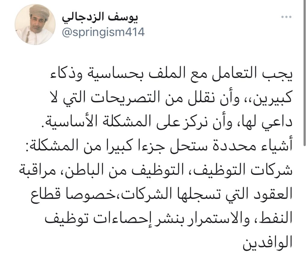 قال يوسف الزدجالي : يجب التعامل مع الملف بحساسية وذكاء كبيرين ، وأن نقلل من التصريحات التي لا داعي لها ، وأن نركز على المشكلة الأساسية. أشياء محددة ستحل جزءا كبيرا من المشكلة : شركات التوظيف ، التوظيف من الباطن ، مراقبة العقود التي تسجلها الشركات ، خصوصا قطاع النفط ، والاستمرار بنشر إحصاءات توظيف الوافدين.