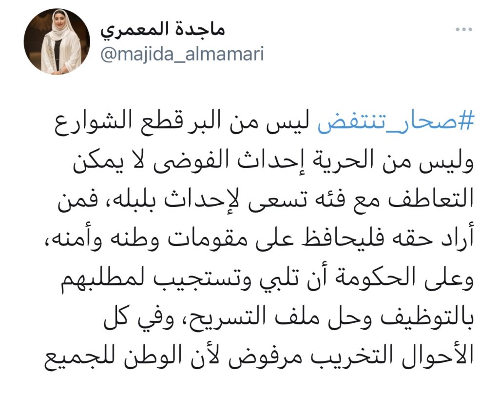وانتقدت ماجدة المعمري بعض التصرف قائلة : ليس من البر قطع الشوارع وليس من الحرية إحداث الفوضى ، لا يمكن التعاطف مع فئة تسعى لإحداث بلبلة ، فمن أراد حقه فليحافظ على مقومات وطنه وأمنه ، وعلى الحكومة أن تلبي وتستجيب لمطلبهم بالتوظيف وحل ملف التسريح ، وفي كل الأحوال التخريب مرفوض لأن الوطن للجميع .