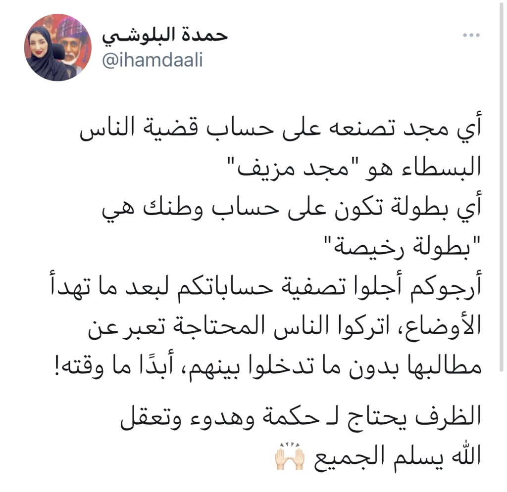 وعلقت حمدة البلوشي : أي مجد تصنعه على حساب قضية الناس البسطاء هو “مجد مزيف”. أي بطولة تكون على حساب وطنك هي “بطولة رخيصة”. أرجوكم أجلوا تصفية حساباتكم لبعد ما تهدأ الأوضاع ، اتركوا الناس المحتاجة تعبر عن مطالبها بدون ما تدخلوا بينهم ، أبدًا ما وقته ! الظرف يحتاج لـ حكمة وهدوء وتعقل ، الله يسلم الجميع .
