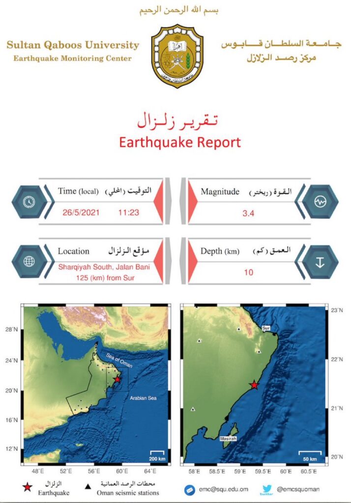 أفاد مركز رصد الزلازال بجامعة السلطان قابوس بوقوع زلزال بقوة٣٫٤ في صدع مصيرة س ١١:٢٣ ص بالتوقيت المحلي.
