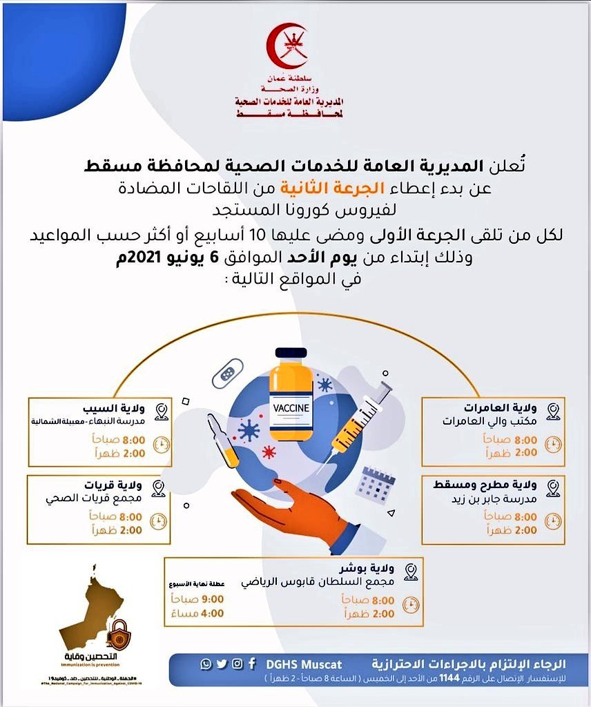 أكدت المديرية العامة للخدمات الصحية لمحافظة مسقط أنه لا صحة لما يتم تداوله عبر منصات التواصل الإجتماعي حول تغيير مواقع التحصين المعلن عنها مسبقا في وسائل التواصل الإجتماعي بمحافظة مسقط والمشار إليها في الإعلان المرفق.