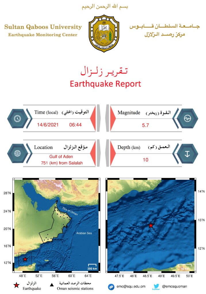 أفاد مركز رصد الزلازل بجامعة السلطان قابوس عن وقوع زلزال بقوة 5.7 ريختر في مياه البحر بخليج عدن صباح اليوم الاثنين ويبعد مركز الزلزال عن ولاية صلالة 751 كيلومتراً وعلى عمق 10 كيلومترات .