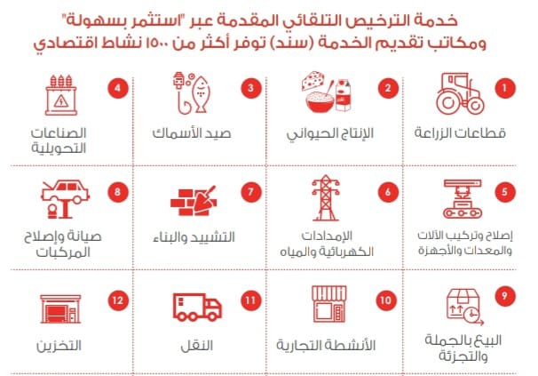 علما بأن المستثمر يمكنه الحصول على ترخيص تلقائي لأكثر من 1500 نشاط اقتصادي والتي تشكل 88% من مجموع الأنشطة الاقتصادية، وتشمل قطاعات الزراعة والإنتاج الحيواني وصيد الأسماك والصناعات التحويلية وإصلاح وتركيب الآلات والمعدات والأجهزة والإمدادات الكهربائية والمياه والتشييد والبناء، بالإضافة إلى قطاعات صيانة وإصلاح المركبات والبيع بالجملة والتجزئة والأنشطة التجارية والنقل والتخزين.