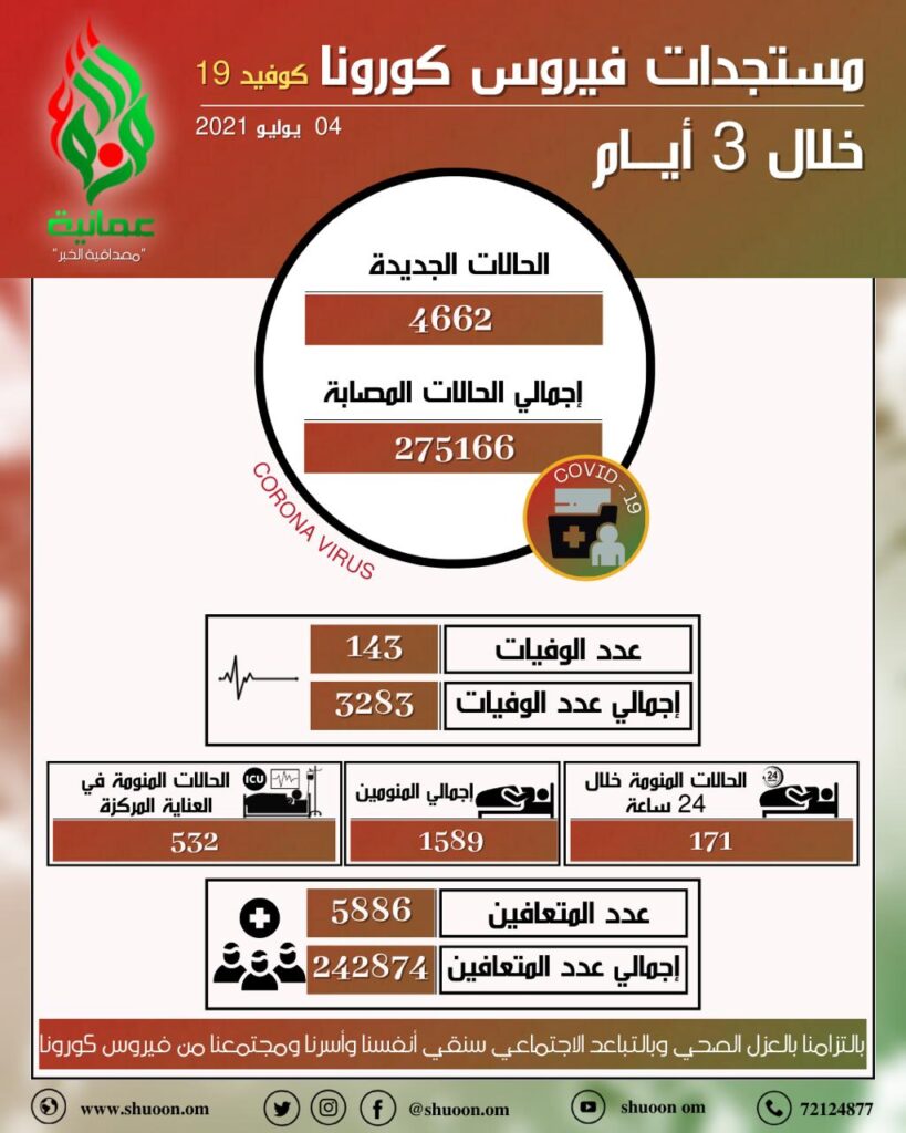 أعلنت وزارة الصحة اليوم الأحد عن تسجيل 4662 إصابة جديدة بمرض فيروس كورونا (كوفيد 19) خلال 3 أيام ، منهم 2337 عمانيا، و 2325 غير عمانيين ، وبذلك يُصبح العدد الكلِّي للحالات المسجَّلة في السلطنة 275166 حالة.