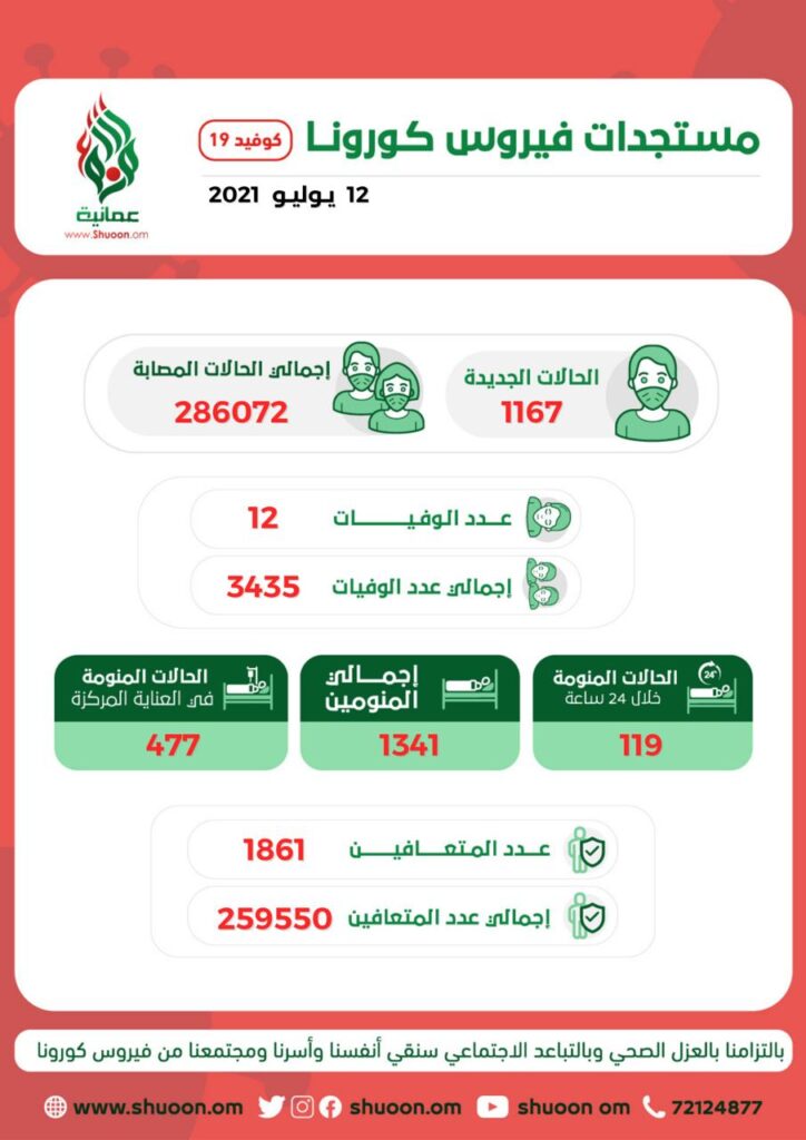 وكشف التقرير اليومي للوزارة أنه تم تسجيل 12 حالة وفاة جديدة، ليرتفع إجمالي الوفيات في السلطنة بهذا الفيروس إلى 3435 حالة وفاة.