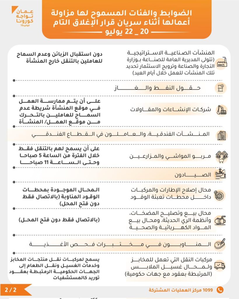 نشر حساب “عمان تواجه كورونا” الضوابط و الفئات المسموح لها مزاولة أعمالها أثناء سريان قرار الإغلاق التام (20_22 يوليو 2021).