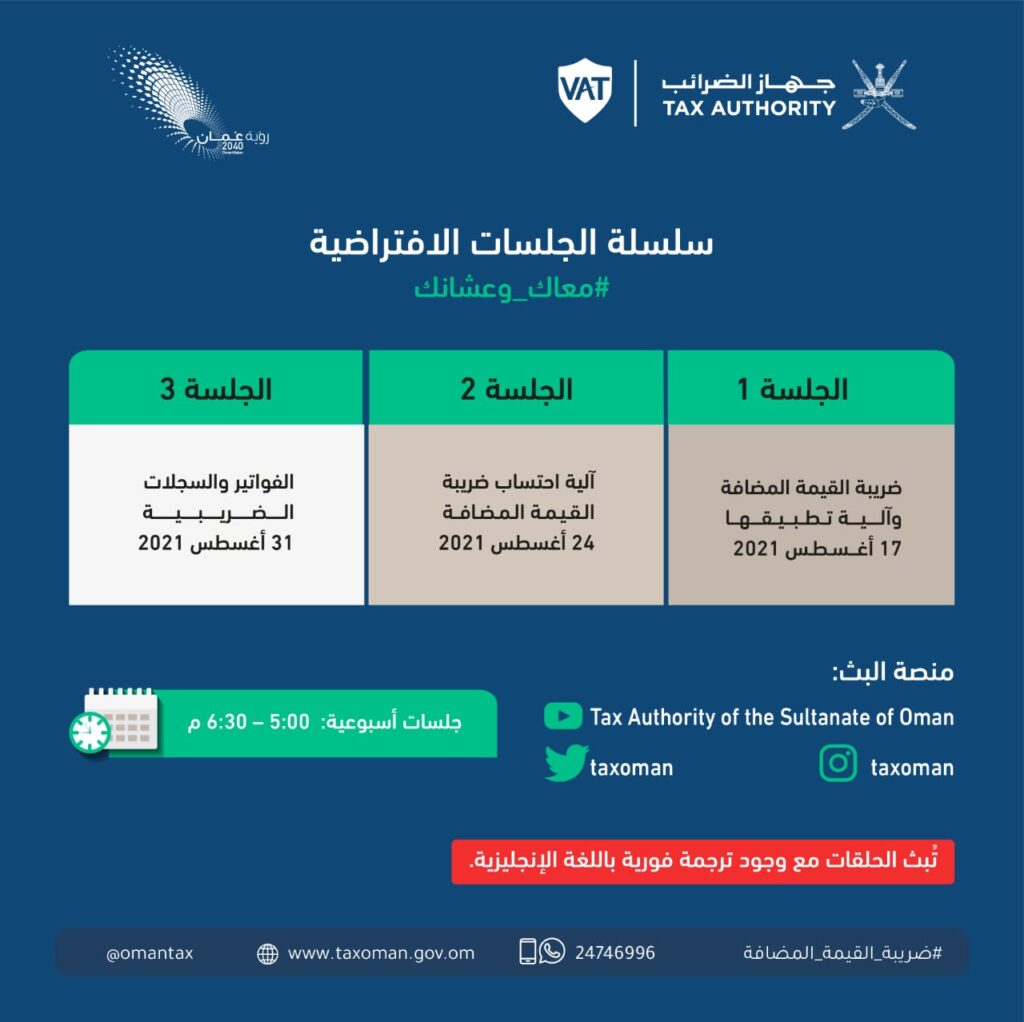 وستجيب جلسة اليوم عن أهم الأسئلة المتعلقة بضريبة القيمة المضافة وآلية تطبيقها والتي سيتم بثها عبر منصات التواصل الاجتماعي الرسمية لجهاز الضرائب في تمام الساعة الخامسة مساءً. بينما تناقش الجلسة الثانية والثالثة آلية احتساب ضريبة القيمة المضافة والفواتير والسجلات الضريبية، والتي من المزمع عقدها كل ثلاثاء.