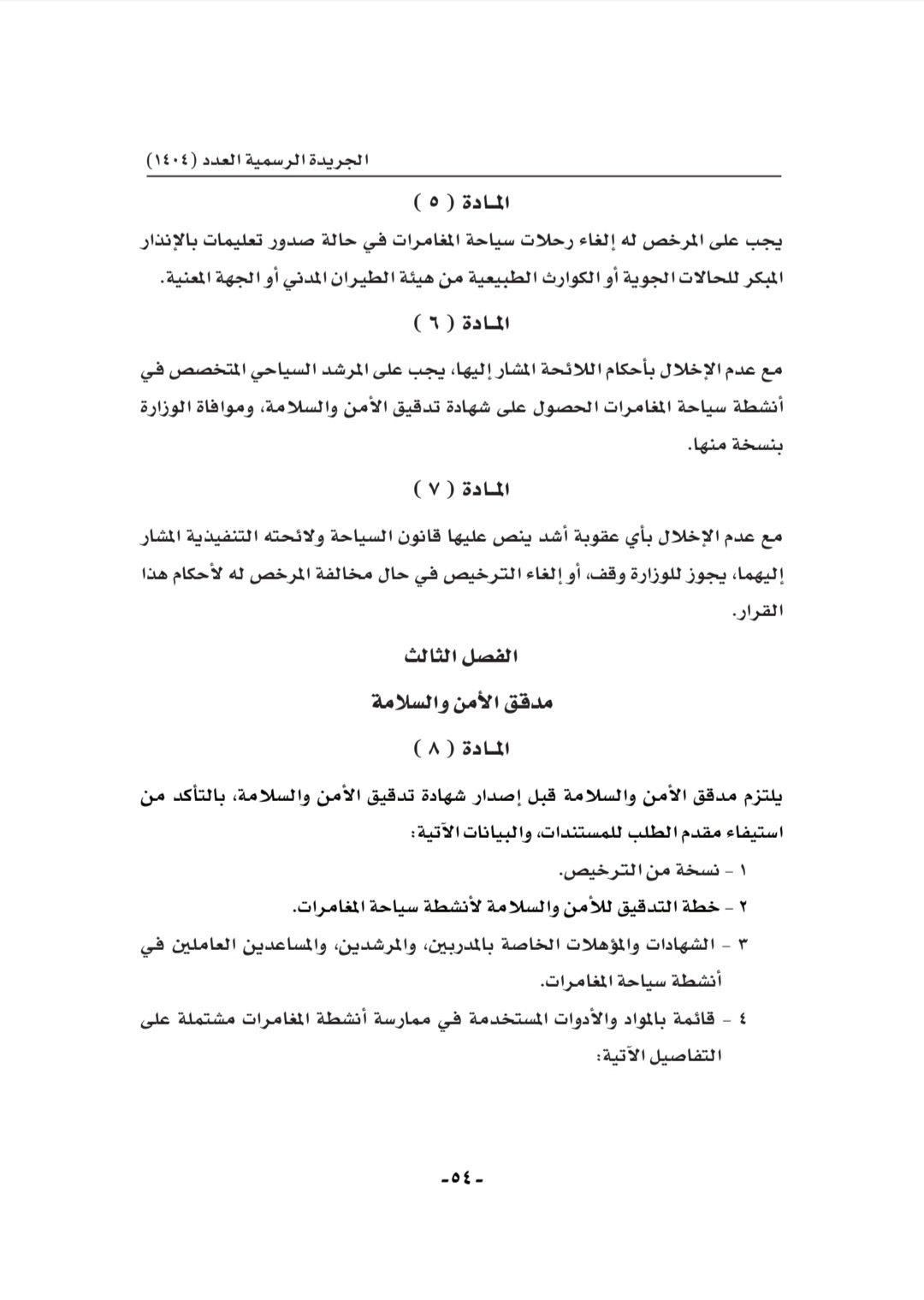 المادة الثانية: مع عدم الإخلال بأحكام اللائحة التنفيذية لقانون السياحة المشار إليه، يعمل في شأن مزاولة نشاط تنظيم رحلات سياحة المغامرات، بالشروط والضوابط المرفقة.