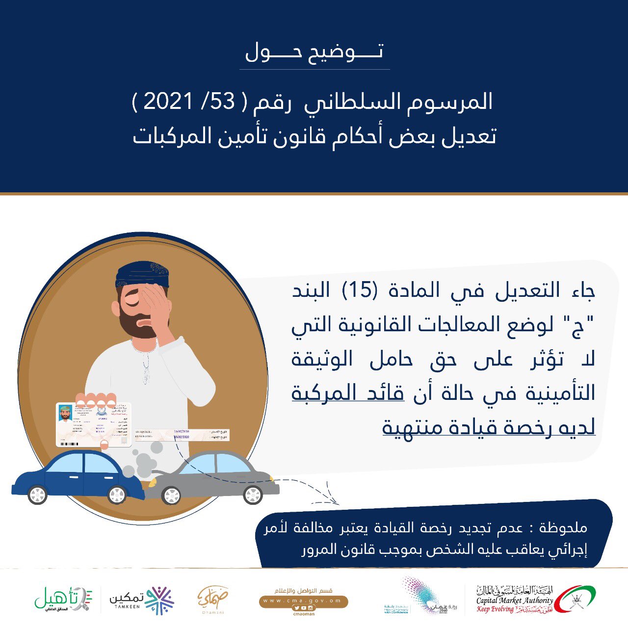 نشرت الهيئة العامة لسوق المال توضيحا حول المرسوم السلطاني 53 / 2021، بشأن تعديل بعض أحكام قانون تأمين المركبات.