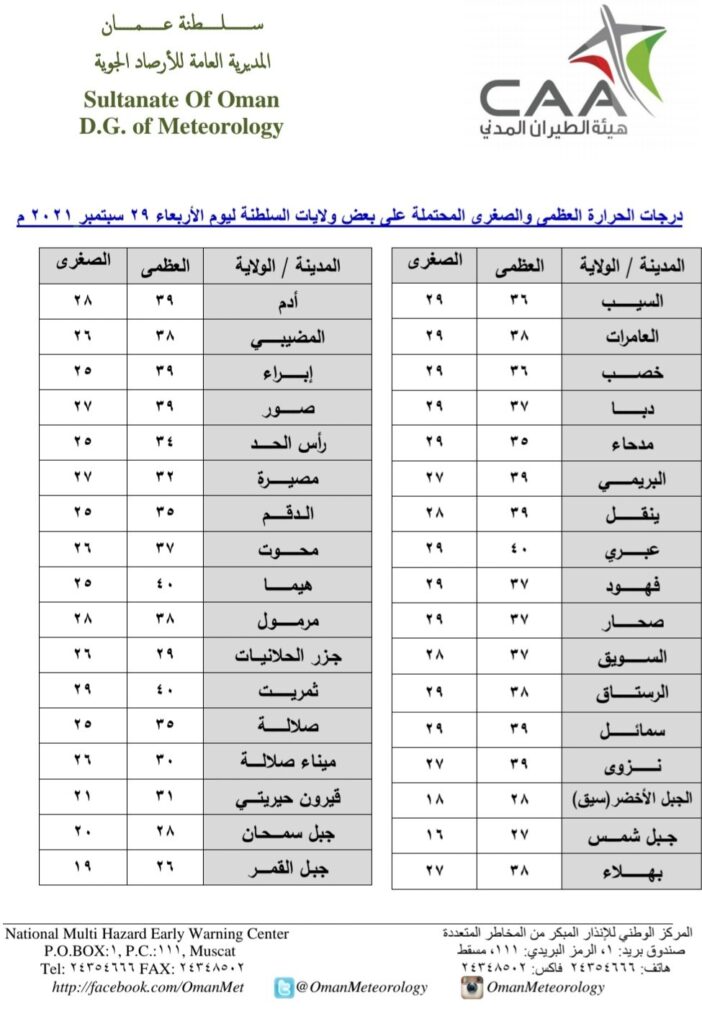 أوضحت المديرية العامة للأرصاد الجوية اليوم الأربعاء 29 سبتمبر 2021 أن حالة الطقس صحو إلى غائم جزئياً على الشريط الساحلي لمحافظة ظفار والجبال المجاورة، وصحو بوجه عام على بقية محافظات السلطنة مع تدفق السحب العالية والمتوسطة، واحتمال تشكل السحب الركامية وهطول أمطار رعدية وهبوب رياح نشطة على جبال الحجر والمناطق المجاورة خلال فترة ما بعد الظهيرة والمساء، واحتمال تشكل السحب المنخفضة أو الضباب آخر الليل والصباح الباكر على سواحل بحر العرب وبحر عمان.