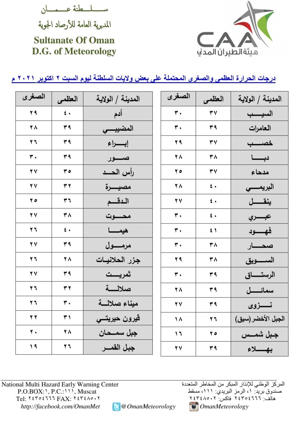 أوضحت المديرية العامة للأرصاد الجوية اليوم السبت 2 أكتوبر 2021 أن حالة الطقس غائم جزئياً على الشريط الساحلي لمحافظة ظفار والجبال المجاورة مع فرص لهطول أمطار متفرقة، وصحو إلى غائم جزئياً على بقية محافظات السلطنة مع تدفق السحب قد تؤدي لهطول أمطار متفرقة على أجزاء من محافظات شمال وجنوب الشرقية والوسطى.