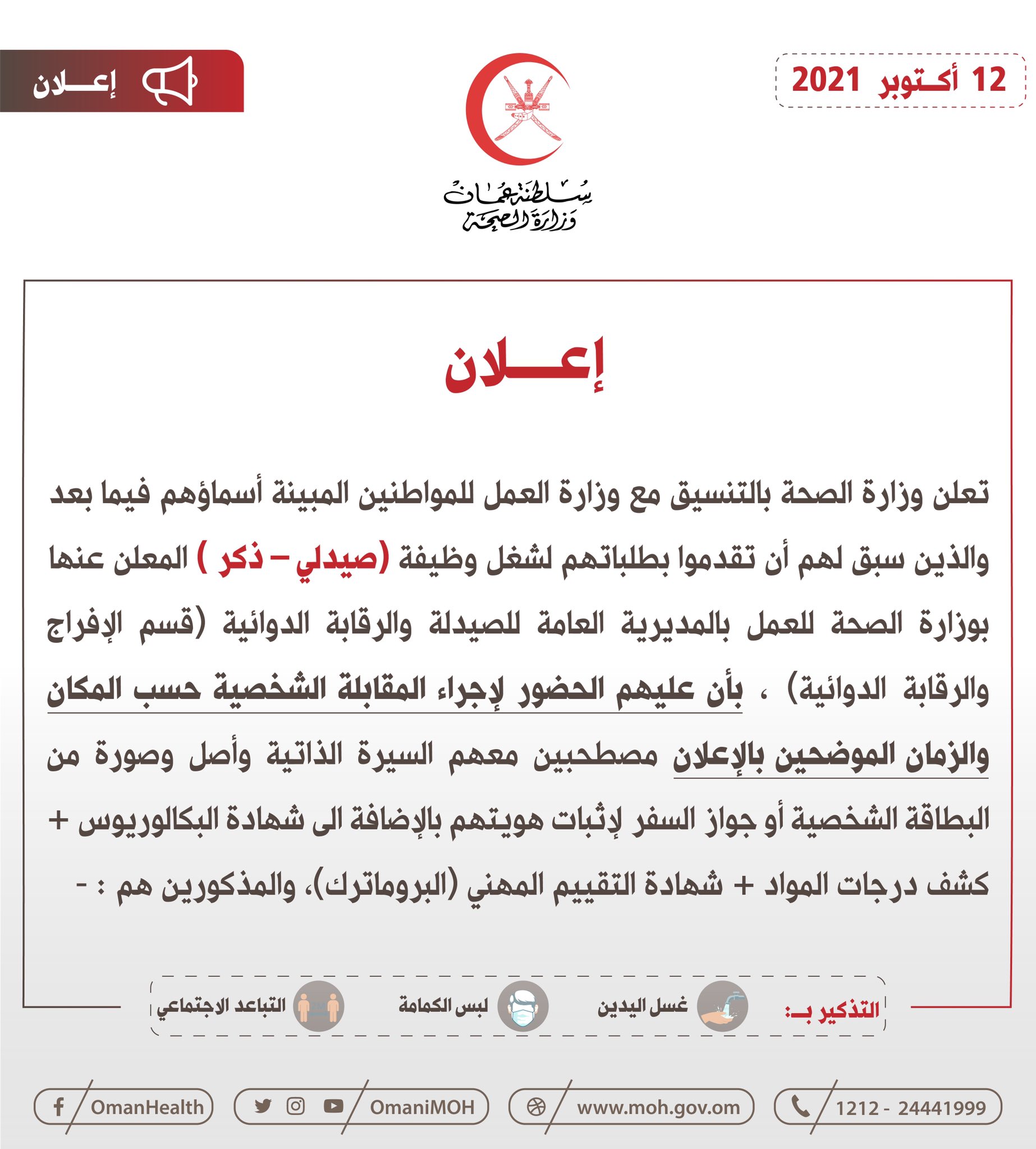 أعلنت وزارة الصحة بالتنسيق مع وزارة العمل أنه على المواطنين المبينة أسماؤهم أدناه والذين سبق لهم أن تقدموا بطلباتهم لشغل وظيفة (صيدلي)، بأن عليهم الحضور لإجراء المقابلة الشخصية حسب المكان والزمان الموضحين بالإعلان.