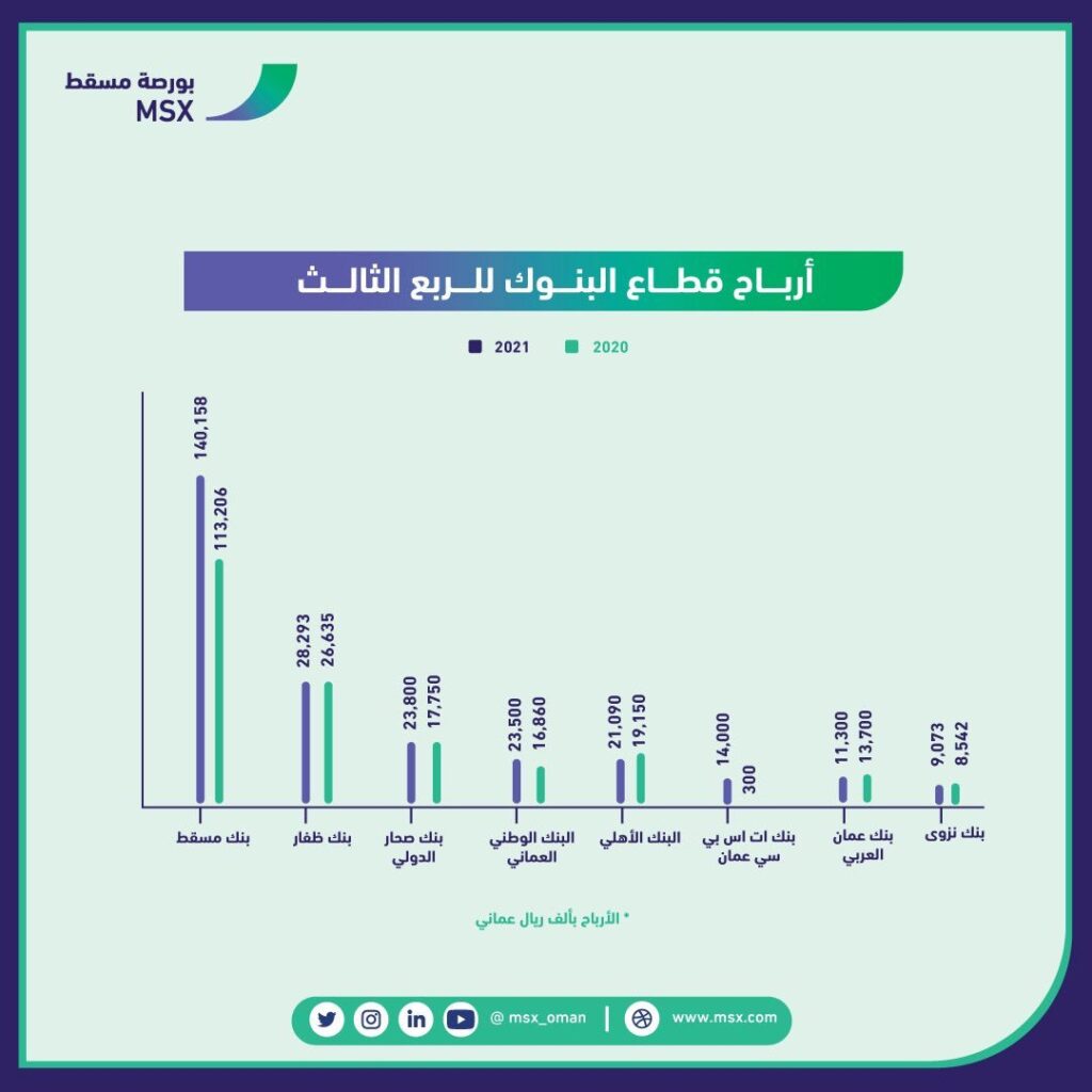 نمت أرباح جميع البنوك المدرجة في بورصة مسقط خلال الأشهر التسعة الأولى من عام 2021م مقارنة مع نفس الفترة من العام الماضي 2020م، بإستثناء بنك عمان العربي الذي تراجعت أرباحه بنسبة 18% تقريبا.