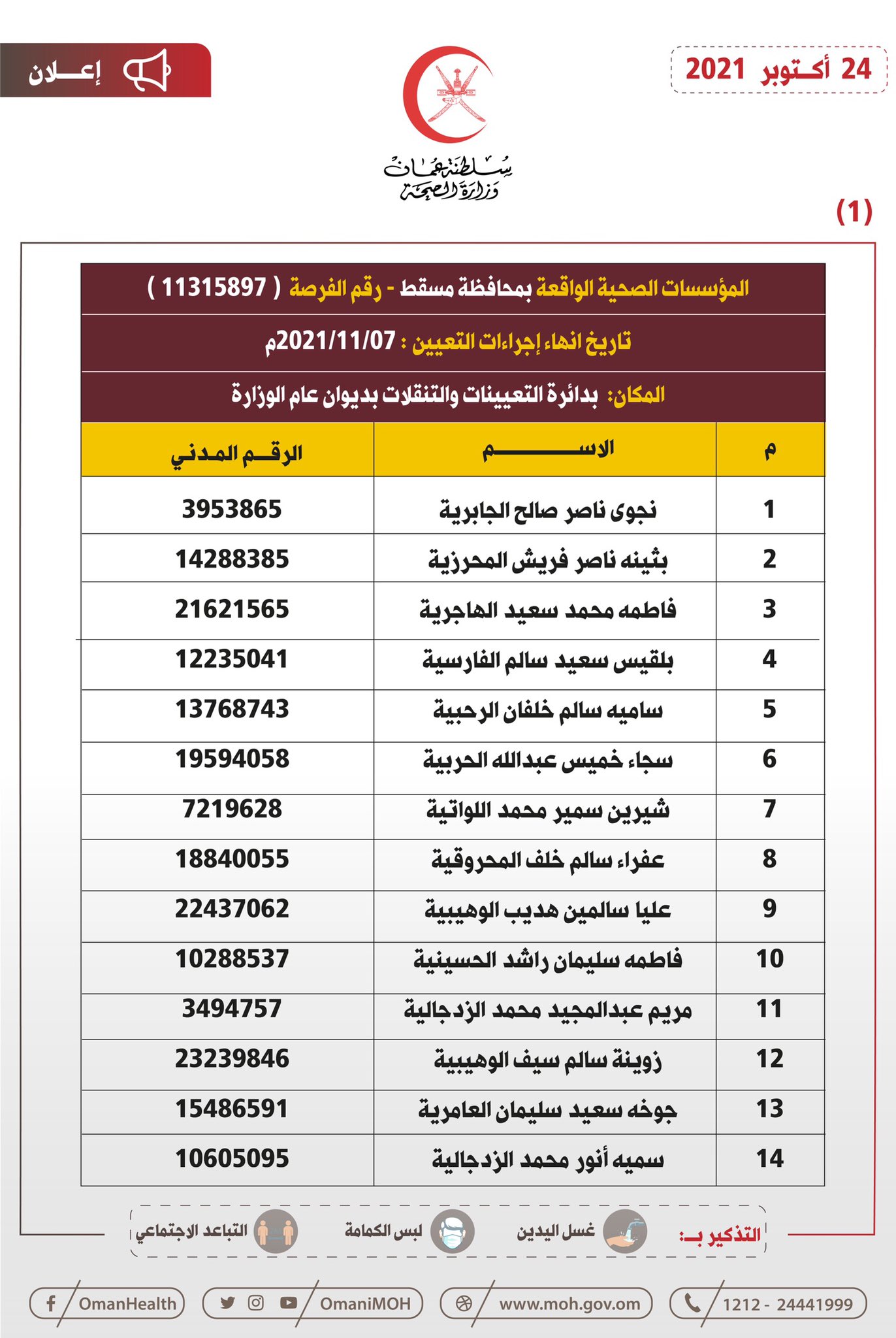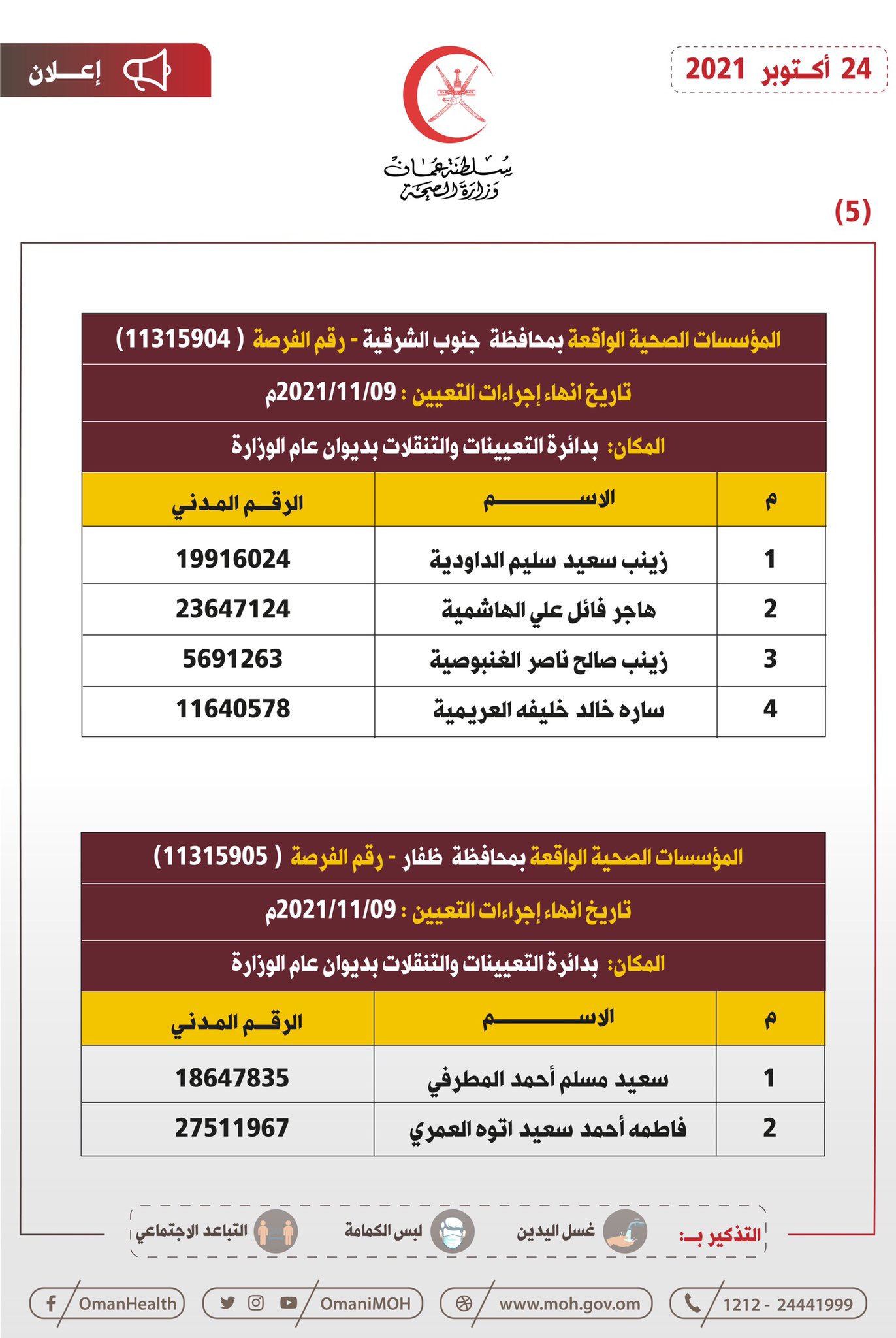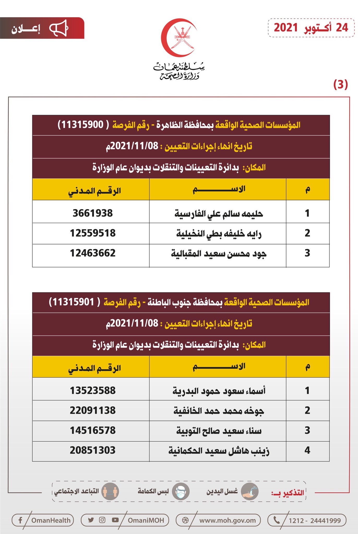 أعلنت وزارة الصحة بالتنسيق مع وزارة العمل أنه على المواطنين المقبولين لشغل وظيفة (صيدلي) مراجعة دائرة التعيينات والتنقلات بديوان عام وزارة الصحة حسب الأماكن والتواريخ الموضحة أدناه وذلك لإنهاء إجراءات تعيينهم.