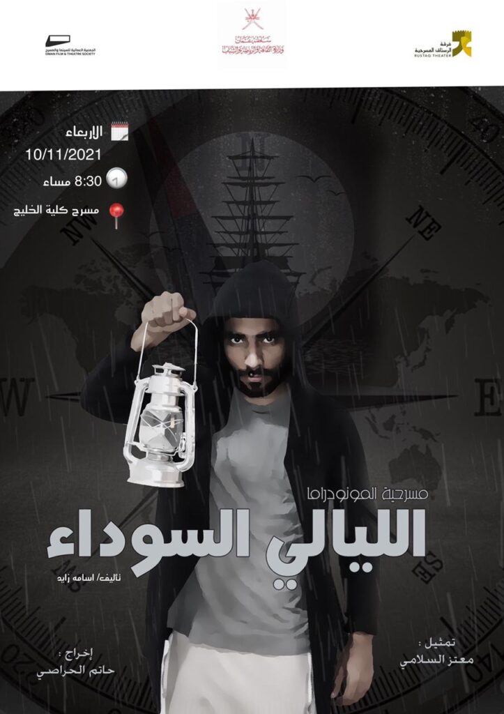 وعرض الليالي السوداء يحكي قصة ناجم الشاب الذي قرر الهروب من مشاكل الحياة ليصل بقاربه الصغير الي وسط المحيط وتبدأ قصته مع صراعه مع العواصف والامواج وهو يحاول البحث عن حياة جديدةوأمل جديد بعيدا عن مدينته التي عاش فيها. عرض “الليالي السوداء” للممثل معتز السلامي، وادارة مسرح محمد السلامي ومؤيد العبري والازياء، والديكور وصوتيات محمد العبيداني، وسينوغرافيا سالم الشقصي وجمال الضوياني، ومساعد مخرج يوسف الخروصي، وإخراج حاتم الحراصي.