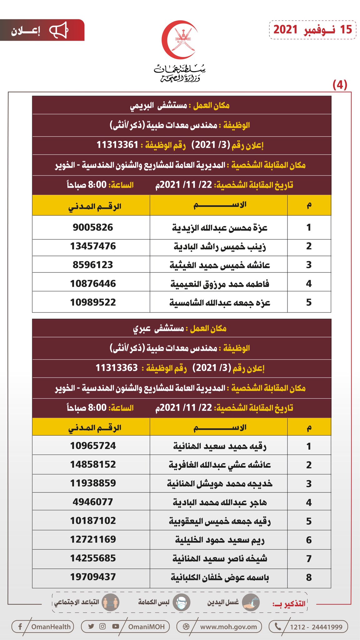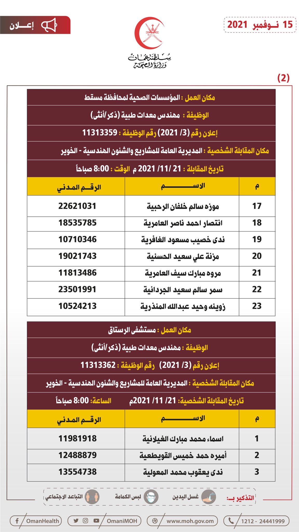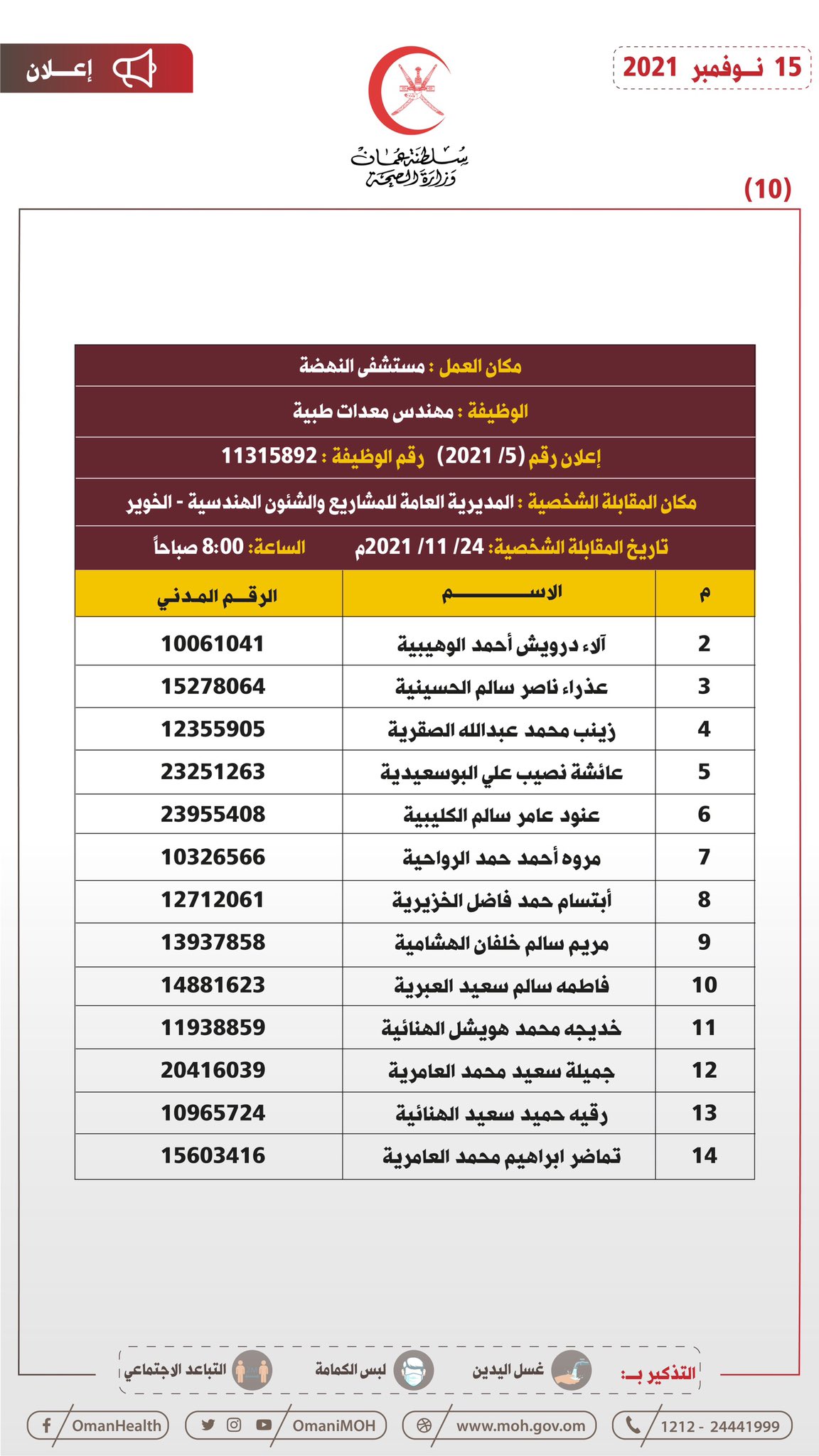 أعلنت وزارة الصحة بالتنسيق مع وزارة العمل للمواطنين المبينة أسماؤهم فيما بعد والذين سبق لهم التقدم لشغل وظيفة (مهندس معدات طبية) عليهم الحضور في الزمان والمكان المحددين لحضور المقابلة الشخصية.