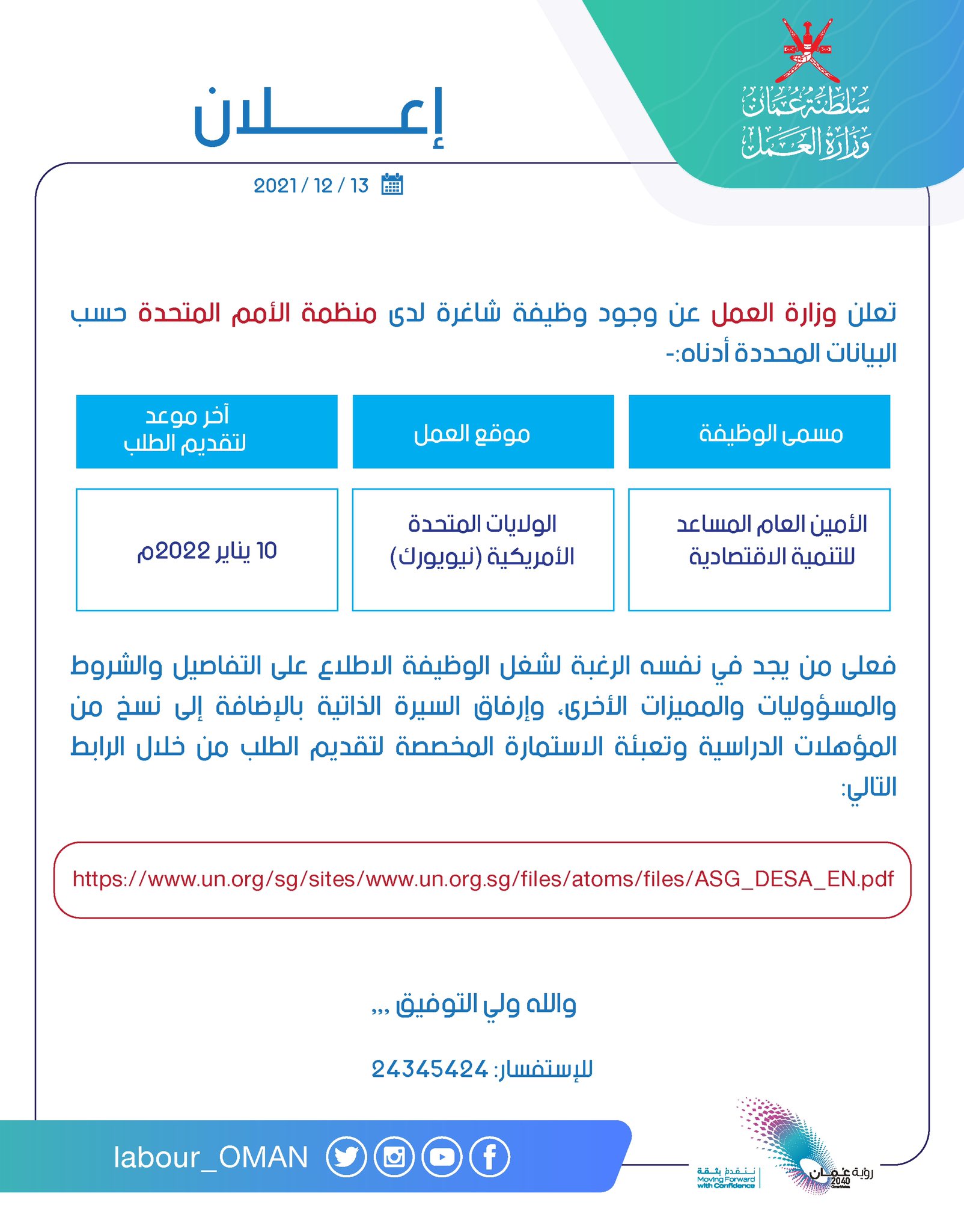 أعلنت وزارة العمل عن وجود وظيفة شاغرة لدى منظمة الأمم المتحدة حسب البيانات المحددة أدناه: وباقي التفاصيل من هنا.