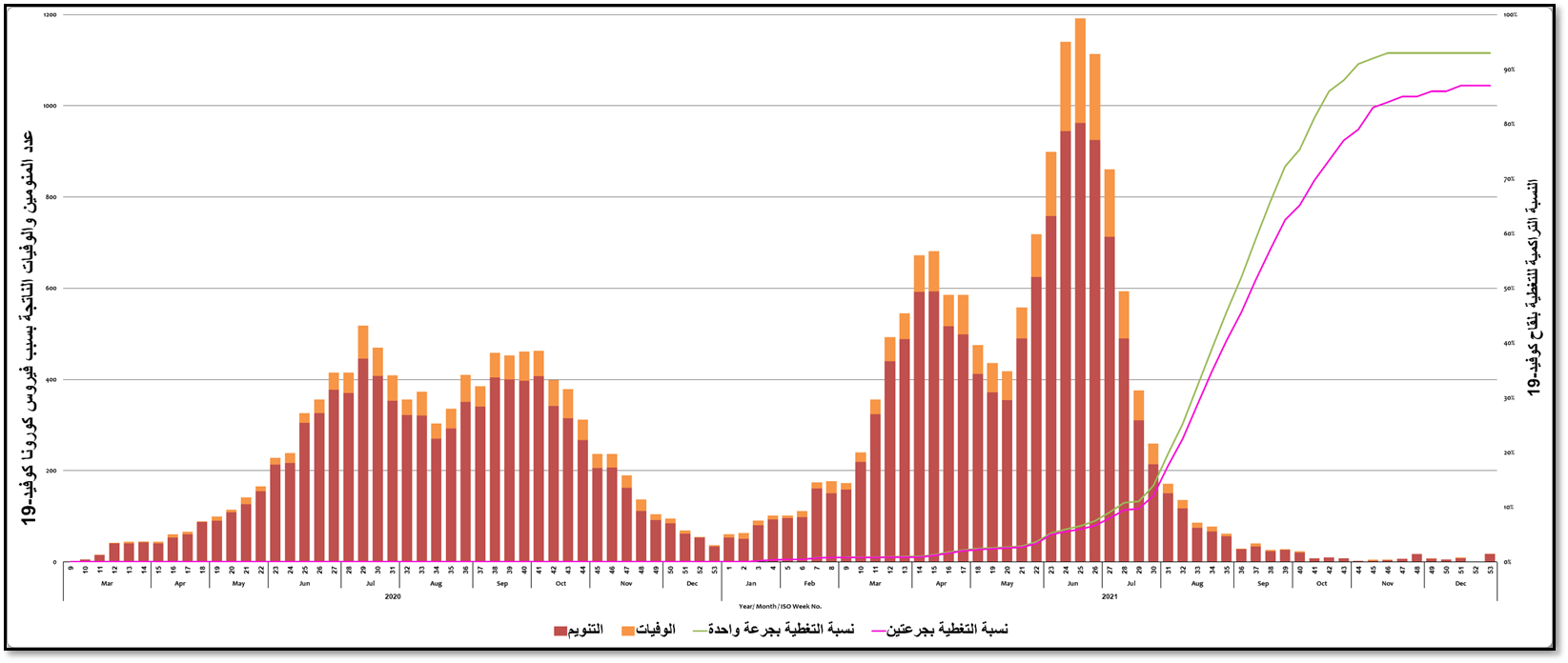 كما يوضح الجدول أدناه (الجدول1) نسب الوفيات والمراضة (المنومين) الناتجة عن مرض كوفيد-19 في سلطنة عمان قياساً بنسبة التغطية بالتطعيمات. ويُظهرالجدول العلاقة العكسية بين عدد جرعات التحصين ونسب الوفيات والمراضة، حيث يتضح أن حوالي 90٪ من الوفيات حدثت بين المجموعة غير المحصنة، في حين لُوحظ أن نسبة الوفيات بين المجموعة المحصنة منخفضة للغاية (7.5%) للمحصنين بجرعة واحدة و (2.5%) للمحصنين بجرعتين.