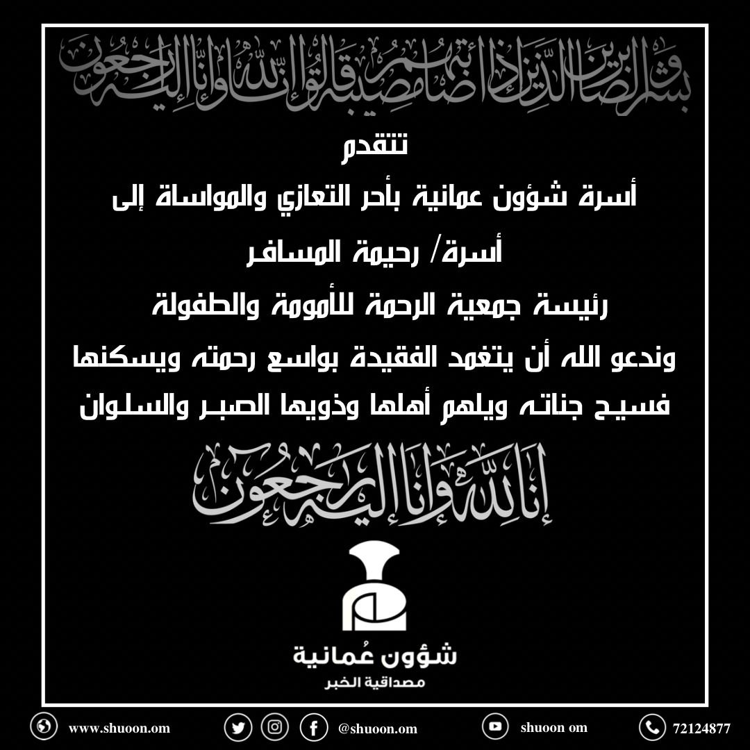 غيّب الموت، اليوم، رئيسة جمعية الرحمة للأمومة والطفولة، رحمة بنت حبيب المسافر، والتي عرفت بالإخلاص والمثابرة لغرس بذور العمل الخيري وتحملت أقسى الظروف الصعبة والاستثنائية لنشر مظلة العمل التطوعي الخيري في كل أرجاء سلطنة عمان.