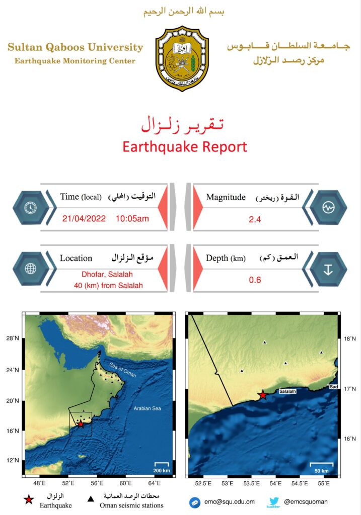 أعلن مركز رصد الزلازل بجامعة السلطان قابوس اليوم الخميس عن وقوع زلزال في محافظه ظفار الساعة العاشرة وخمس دقائق صباحا بقوة 2.4 درجة بمقياس ريختر.