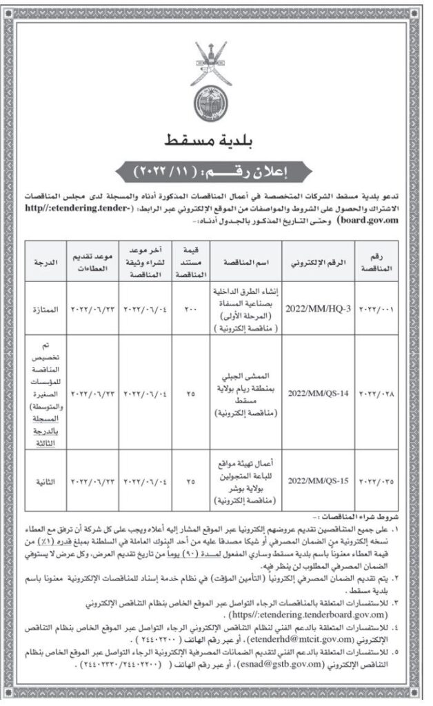 أعلنت بلدية مسقط عن طرح عدد من المناقصات بينها مناقصة لإنشاء ممشى جبلي في منطقة ريام بولاية مسقط .. وأخرى لتهيئة مواقع للباعة المتجولين، وكذلك مناقصة لإنشاء الطرق الداخلية بصناعية المسفاة في ولاية بوشر.