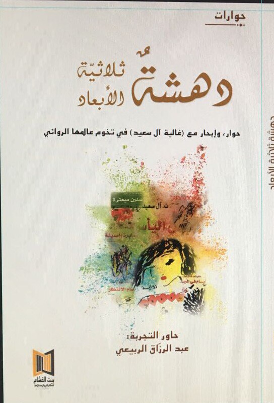 ويضيف الربيعي ” تطرّقنا خلاله إلى عُمان السبعينيات، والظروف المحيطة آنذاك، وسفر الكاتبة للخارج، واقامتها الطويلة هناك، وعلاقتها بالكتابة، وبالمكان الأوّل، وقضايا الكتابة، والحياة، وبعد انتهاء الحوار الذي استمرّ أيّاما، وأسابيع، حتى بعد نشر الملف في العدد الثاني والتسعين الصادر في أكتوبر2017م، طرأت ببالي فكرة نشره في كتاب خاص مع عدد من المقالات التي تناول بها عدد من نقّاد، وأكاديميين، جوانب من تجربتها الروائيّة، فكان “دهشة ثلاثيّة الأبعاد”.