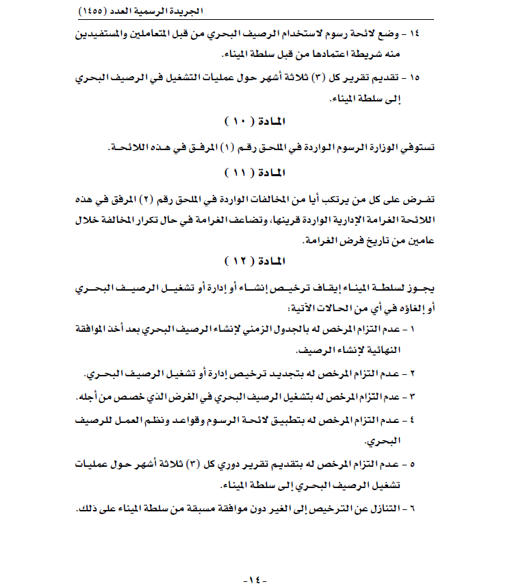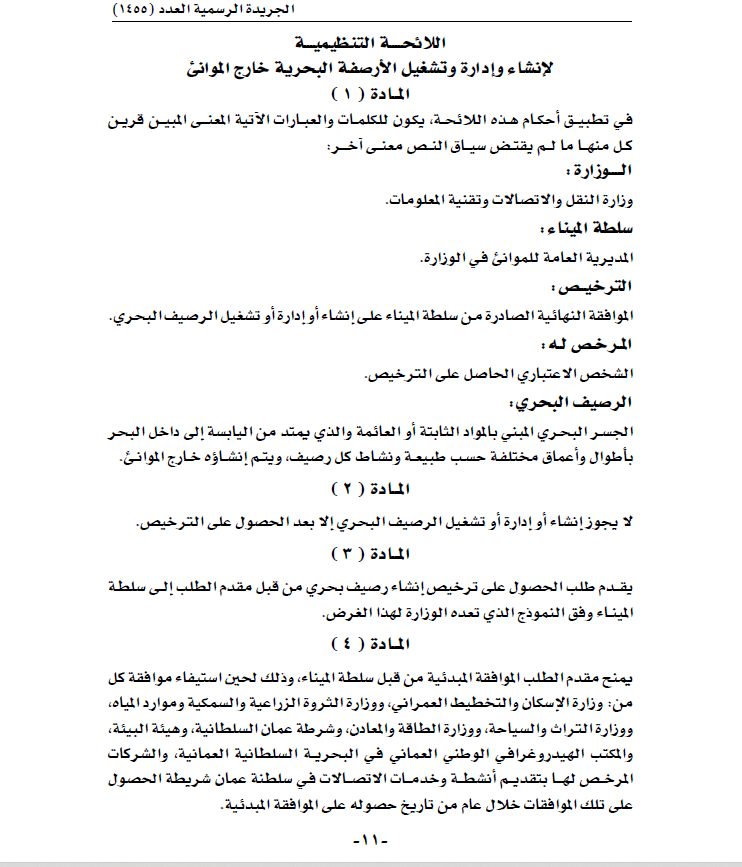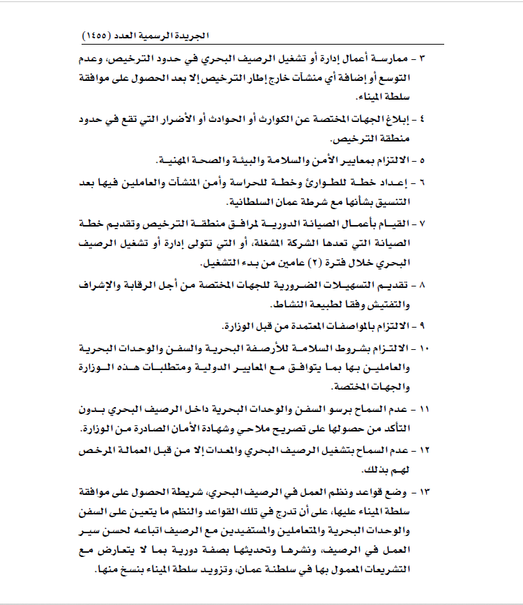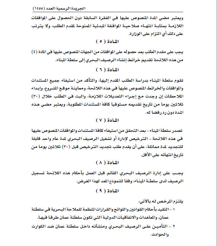 أصدر معالي المهندس سعيد بن حمود المعولي وزير النقل والاتصالات وتقنية المعلومات قرارا وزاريا رقم 125 لسنة 2022، بإصدار اللائحة التنظيمية لإنشاء وإدارة وتشغيل الأرصفة البحرية خارج الموانئ.