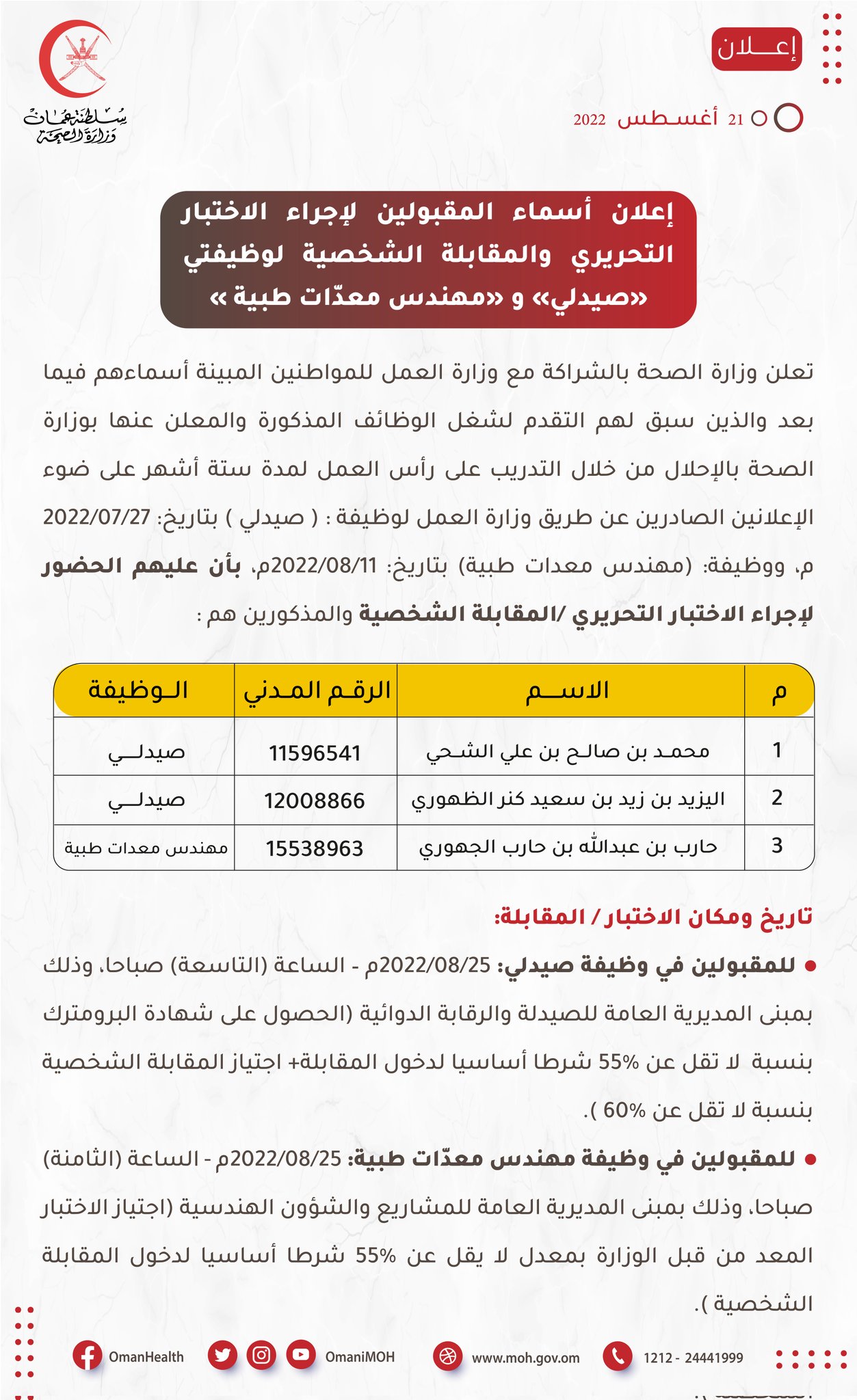 أعلنت وزارة الصحة بالشراكة مع وزارة العمل أنه على المواطنين المبينة أسماءهم أدناه والذين سبق لهم التقدم لشغل الوظائف المعلن عنها بوزارة الصحة على ضوء الإعلانين الصادرين لوظيفة: ( صيدلي ) ووظيفة: (مهندس معدات طبية) الحضور لإجراء الاختبار التحريري /المقابلة الشخصية.
