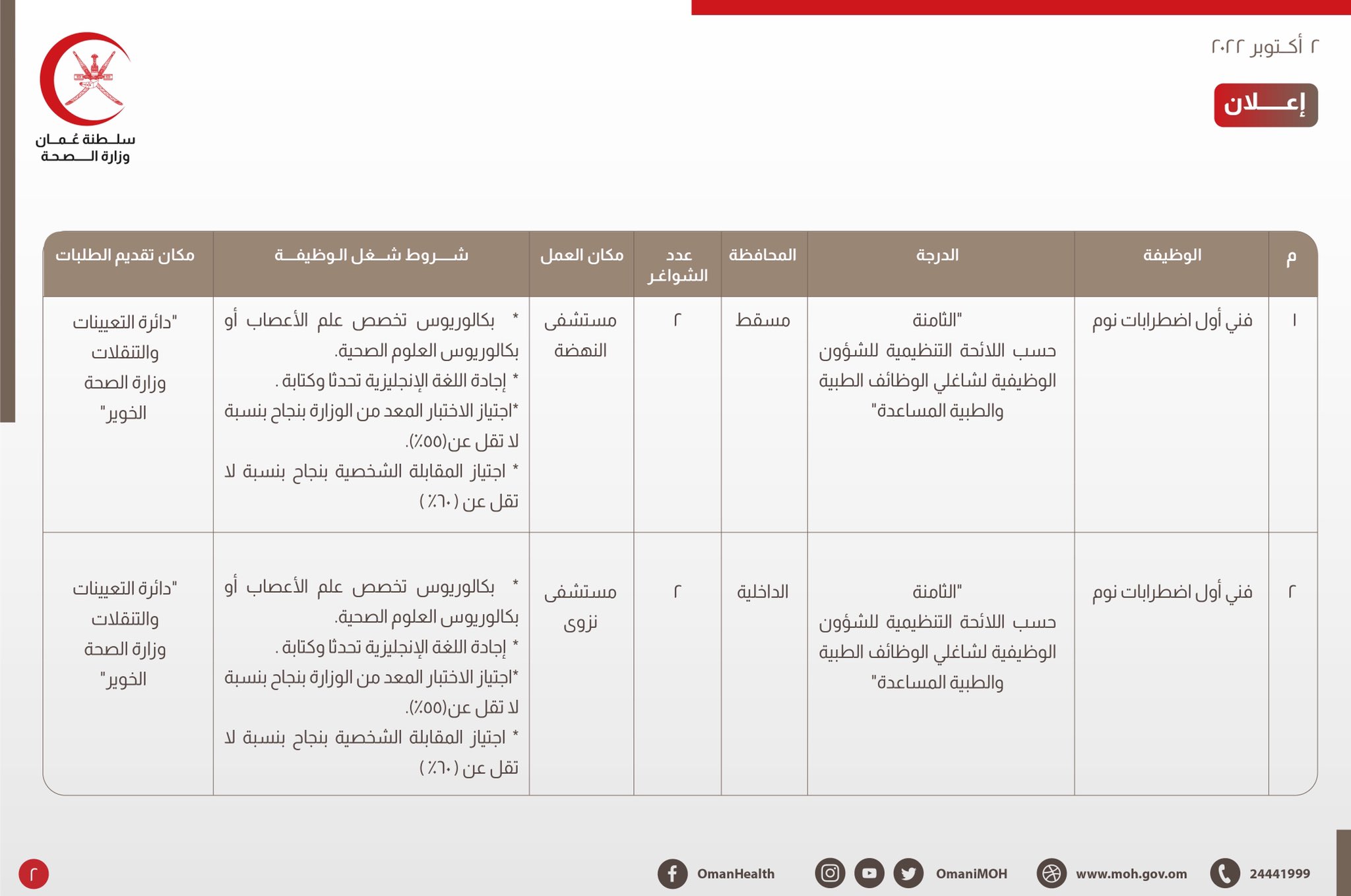 وأوضحت الوزارة أنه على من يجد في نفسه الرغبة لشغل إحدى الوظائف ويكون مستوفيا للشروط المحددة؛ مراجعة ديوان عام وزارة الصحة (دائرة التعيينات والتنقلات) خلال ساعات الدوام الرسمي اعتبارا من يوم الأثنين الموافق ٣/ ١٠/ ٢٠٢٢م حتى تاريخ نهاية يوم الأثنين الموافق ١٧/ ١٠/ ٢٠٢٢م، ولن ينظر في أي طلـب بعـد انقضاء فترة التسجيل.