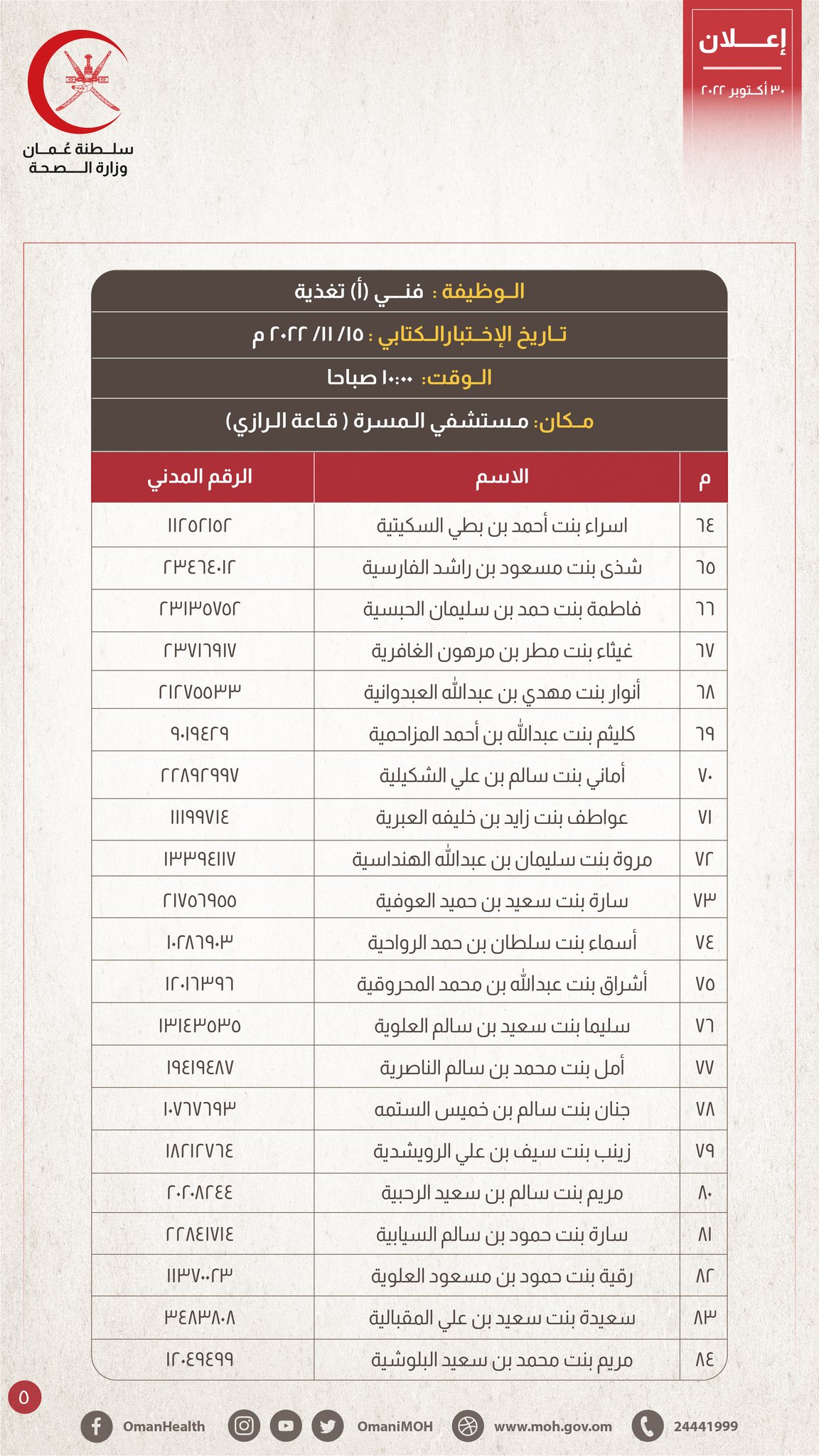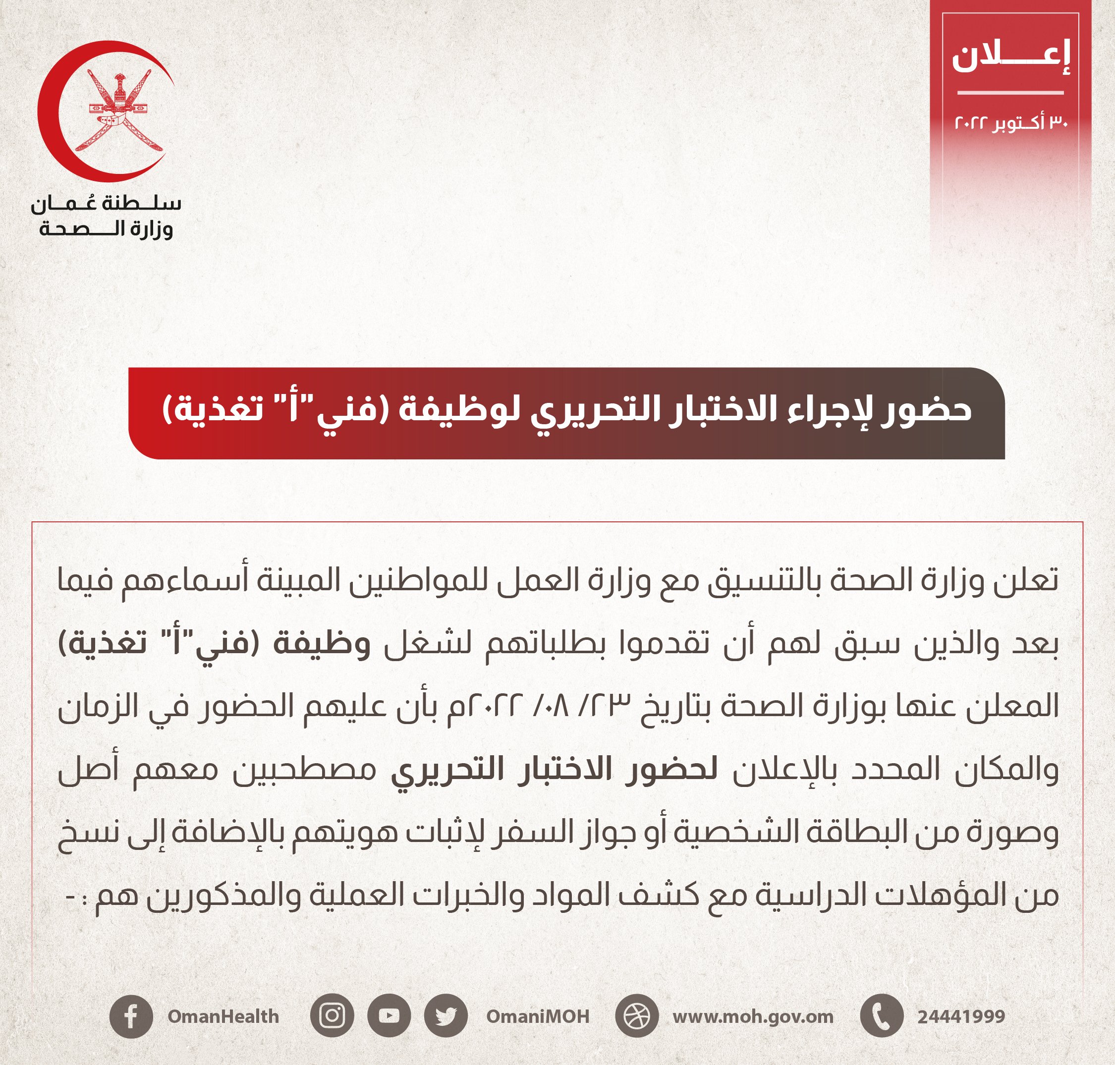 أعلنت وزارة الصحة بالتنسيق مع وزارة العمل أنه على المواطنين المبينة أسماءهم والذين سبق لهم أن تقدموا بطلباتهم لشغل وظيفة (فني”أ” تغذية) بأن عليهم الحضور في الزمان والمكان المحدد بالإعلان لحضور الاختبار التحريري.
