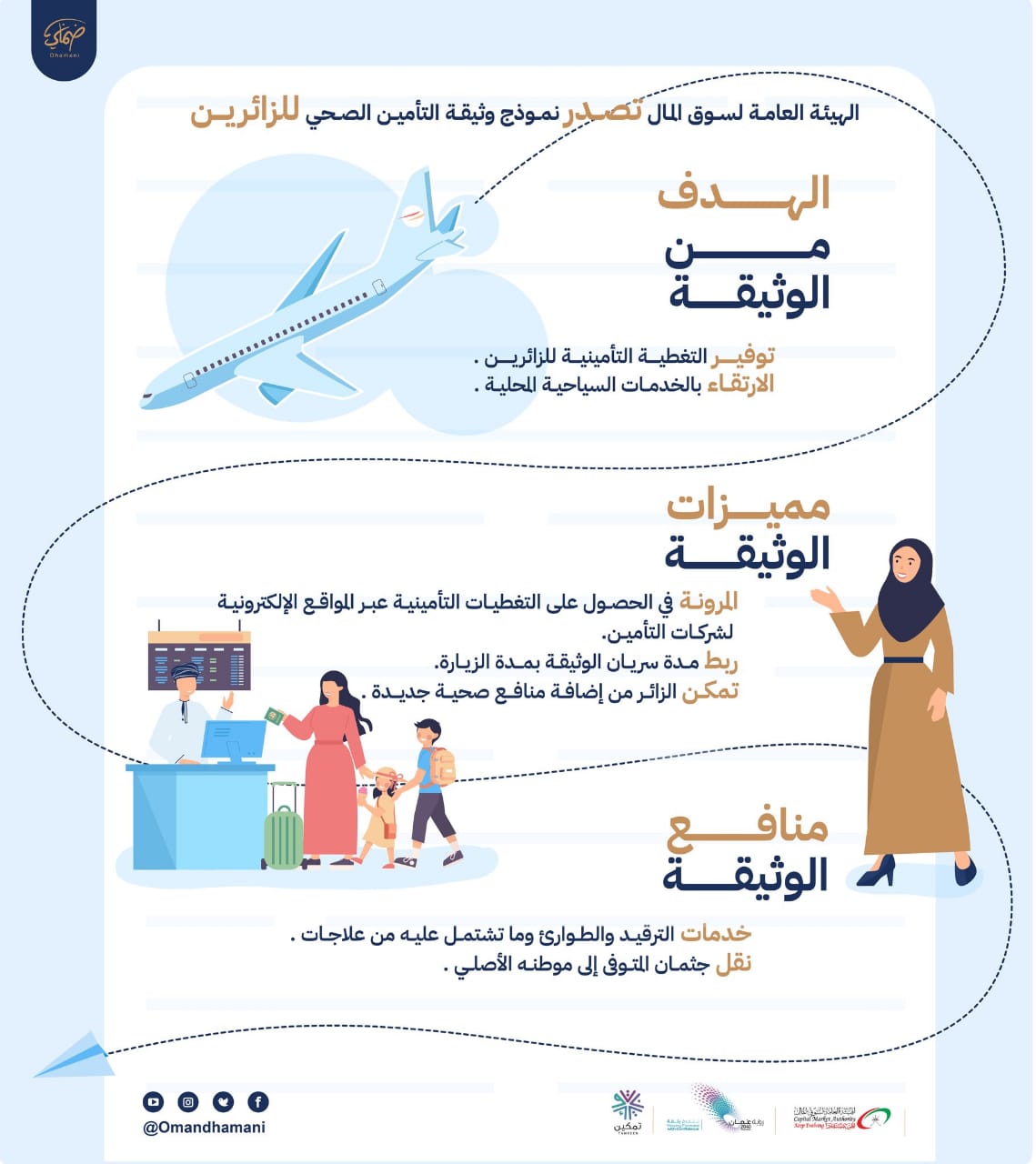 أصدرت الهيئة العامة لسوق المال نموذج وثيقة التأمين الصحي للزائرين مشتملة على الخدمات العلاجية الأساسية في حالة تعرض الزائر للخطر أو الإصابة على الأراضي العمانية، بهدف توفير التغطية التأمينية للزائرين عبر مختلف المنافذ الحدودية إلى سلطنة عمان.