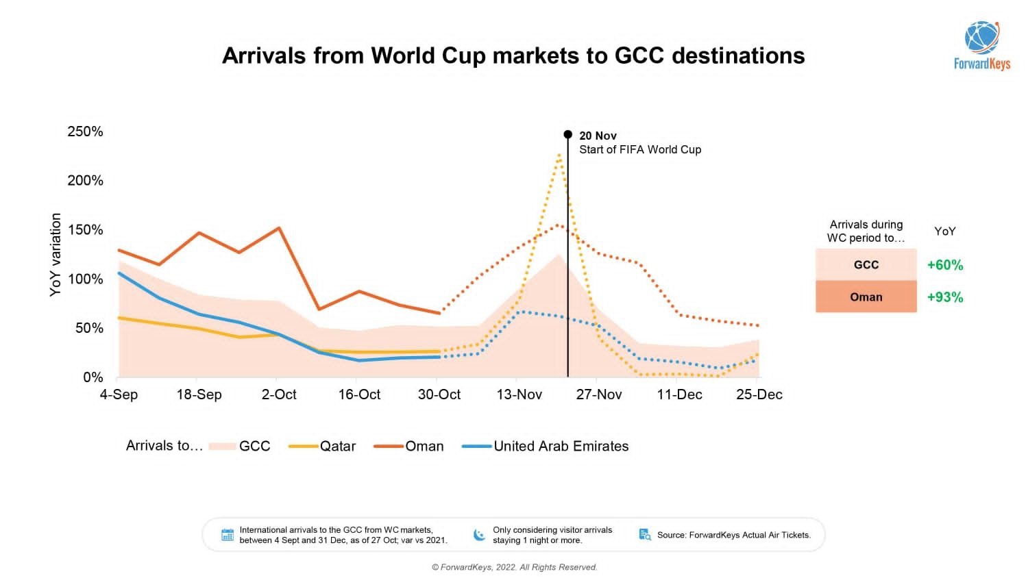 أصدرت شركة ForwardKeys وهي شركة دولية مقرها أسبانيا ، والتي تعتبر من الشركات الرائدة عالمياً في مجال بيانات وتحليلات السفر، أحدث بيانات حجوزات تذاكر الطيران، وخاصة خلال شهري نوفمبر وديسمبر من العام الحالي 2022، وتظهر البيانات أن سلطنة عُمان تسجل زيادة كبيرة في الأداء مقارنة بالعديد من المقاصد السياحية في المنطقة، حيث تشهد زيادة بنسبة تفوق 93٪ من بداية سبتمبر وحتى نهاية العام الحالي 2022 وذلك مقارنة بنفس الفترة من العام الماضي في عدد الزوار من الأسواق العالمية وخاصة من الدول الأوروبية ومن ودول الشرق الأوسط، فضلًا عن زيادة بنسبة تتعدى 156٪ في عدد الزوار من الأسواق الإقليمية.