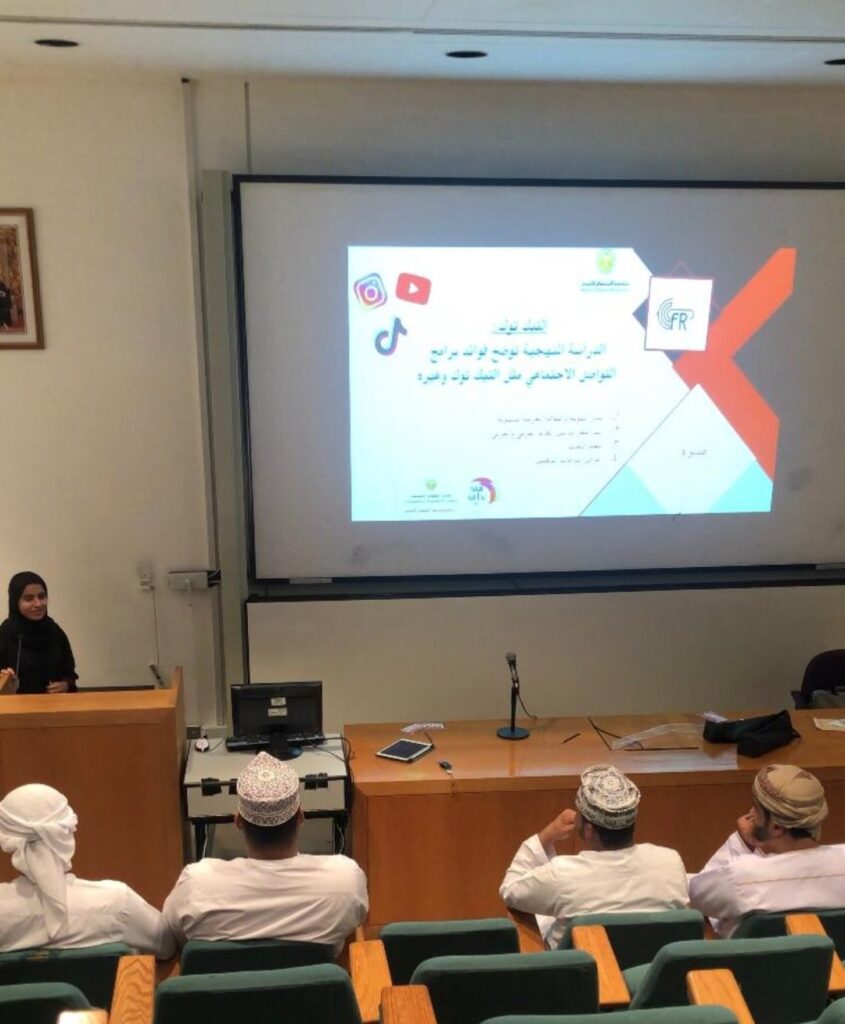 نظمة جماعة الايمان بالبحث الابداعي (CFR) وبالتعاون مع مركز البحوث الانسانية في جامعة السلطان قابوس ووزارة الرياضة والثقافة والشباب محاضرة بجامعة السلطان قابوس بعنوان تأثير المؤثرين العرب ومواقع التواصل الاجتماعي على المجتمع العماني .