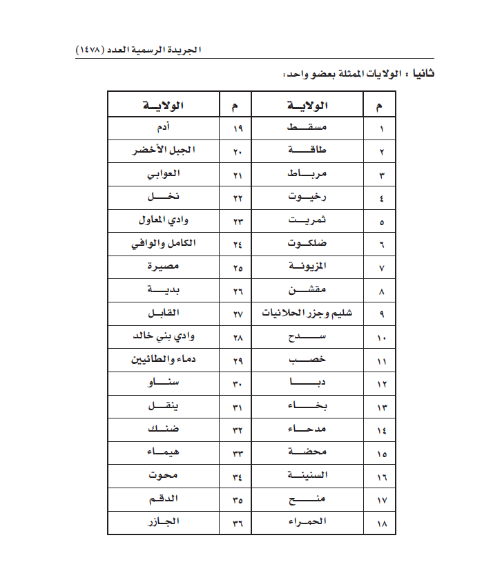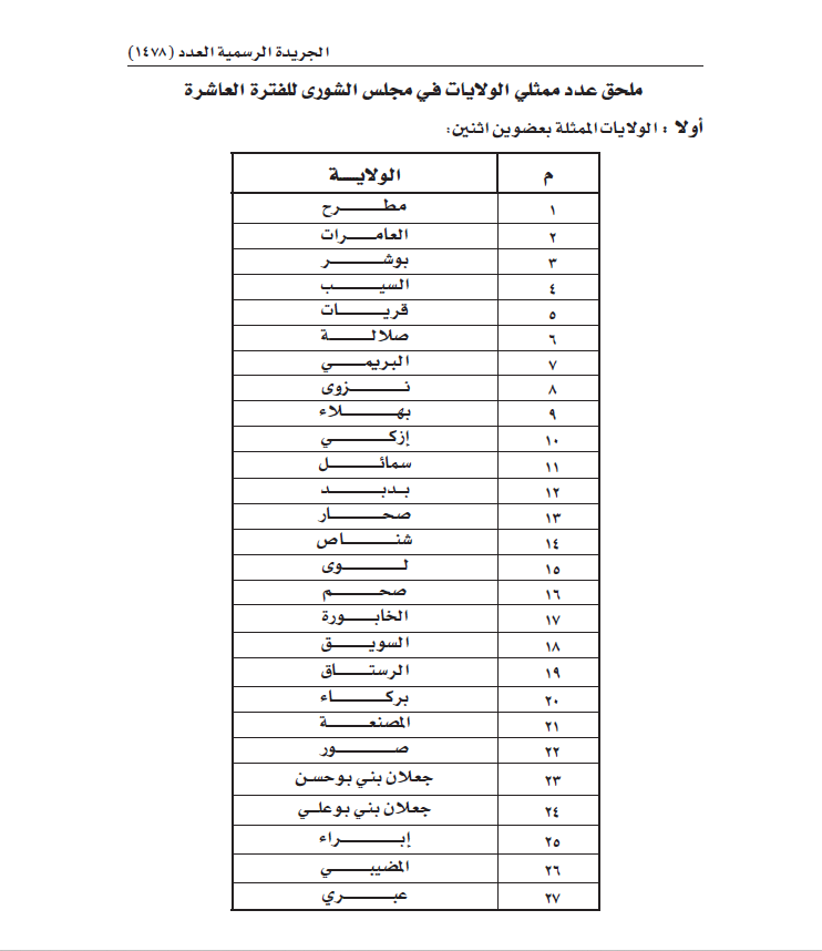 يحدد عدد ممثلي الولايات في مجلس الشورى للفترة العاشرة وفقا للملحق المرفق.