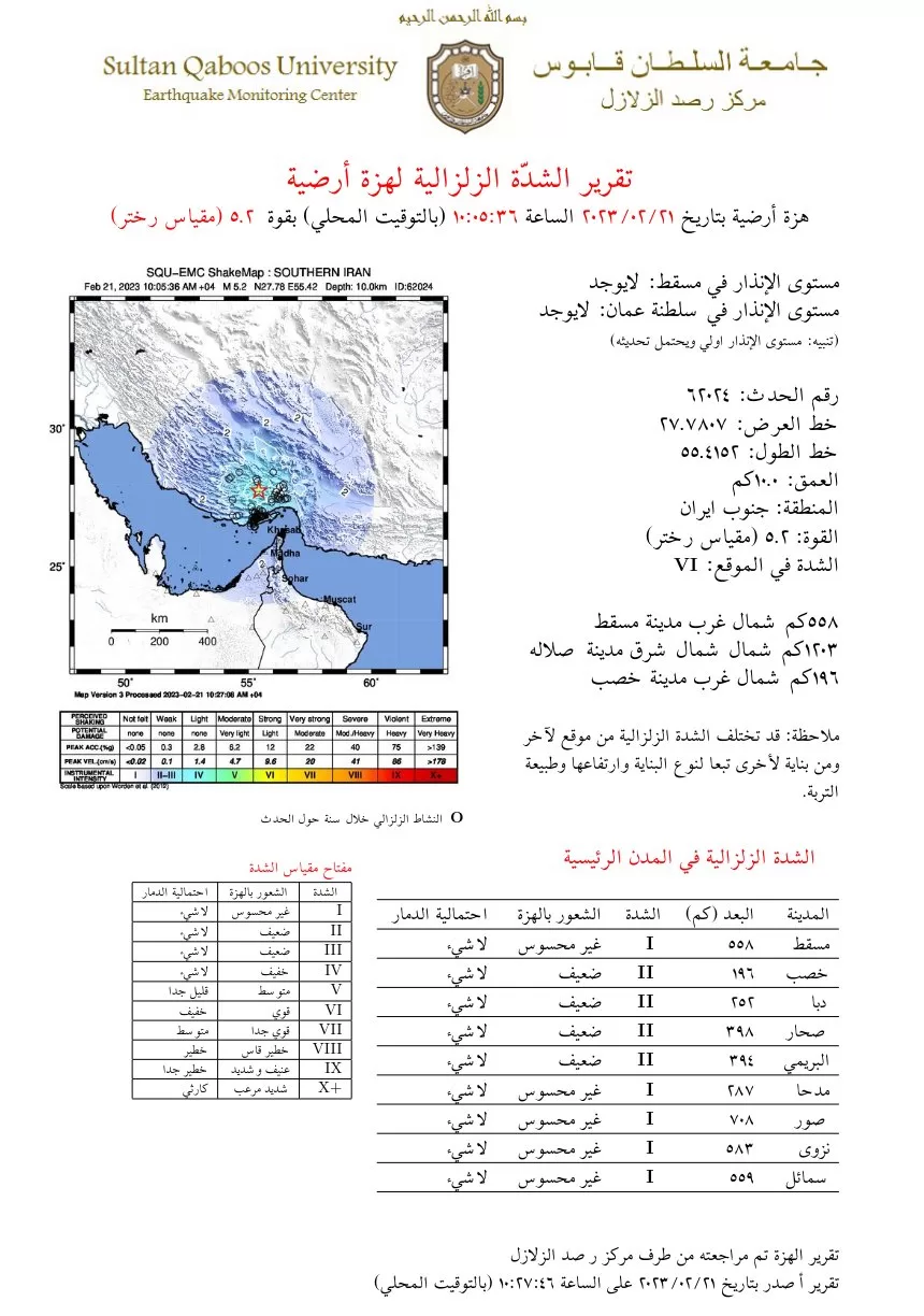 أصدر مركز رصد الزلازل في جامعة السلطان قابوس تقريراً عن هزة أرضية وقعت في جنوب إيران وشعر بها عدد من المواطنين في بعض الولايات.