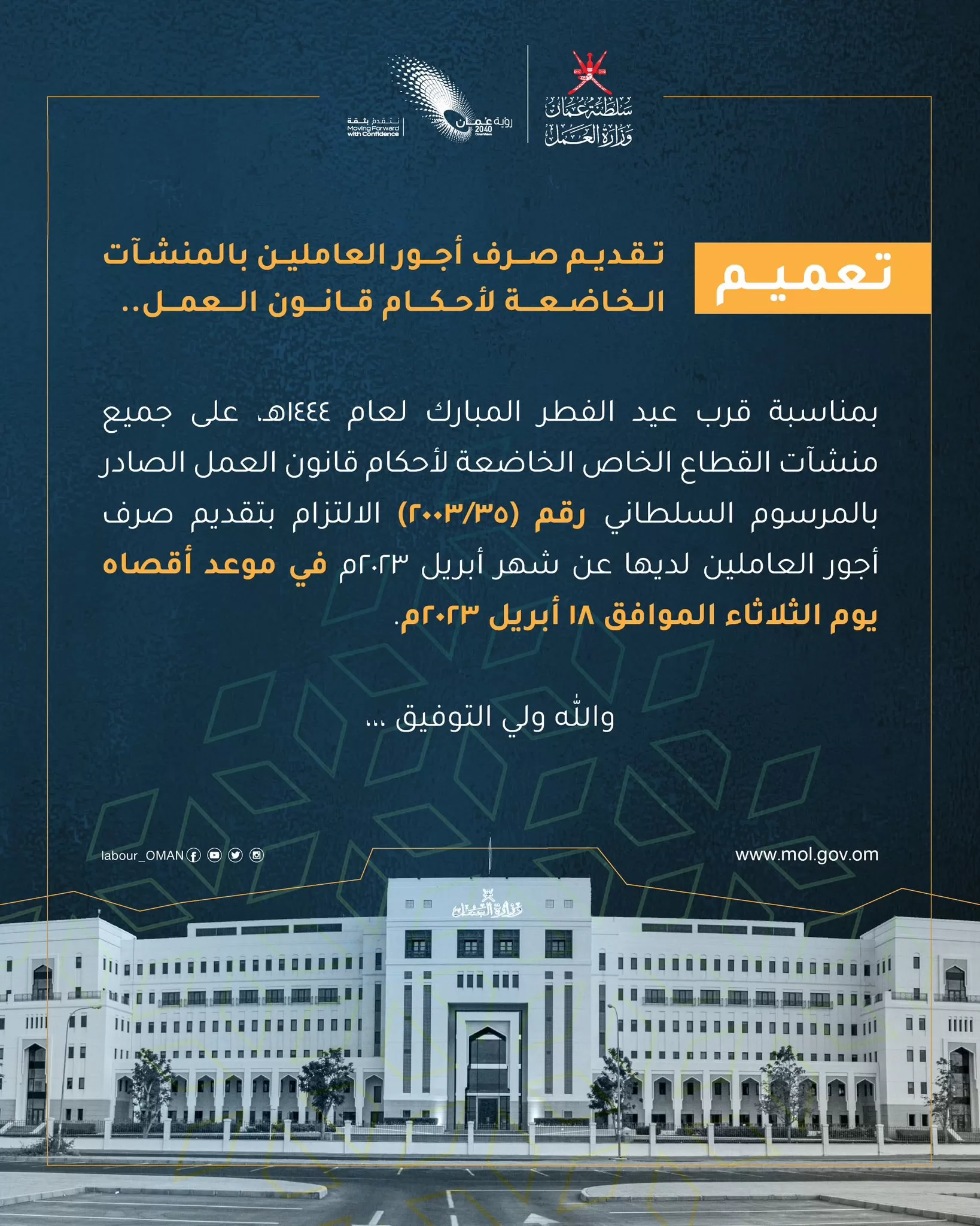 وتضمن التعميم تقديم صرف الأجور في موعد أقصاه يوم الثلاثاء الموافق ١٨ أبريل ٢٠٢٣م.