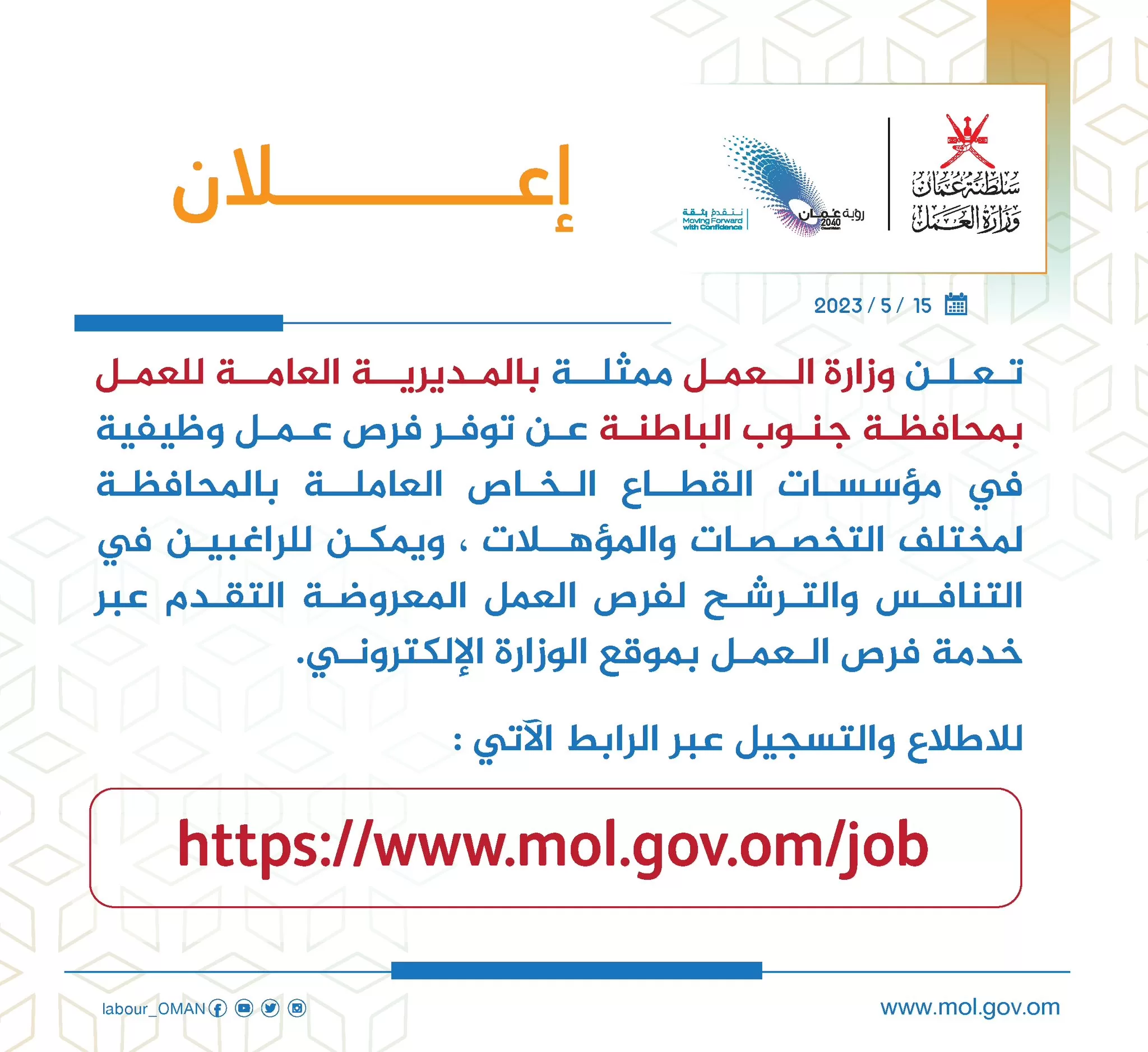 أعلنت وزارة العمل توفر عدد من فرص العمل في مؤسسات القطاع الخاص العاملة بمحافظة جنوب الباطنة لمختلف التخصصات والمؤهلات.