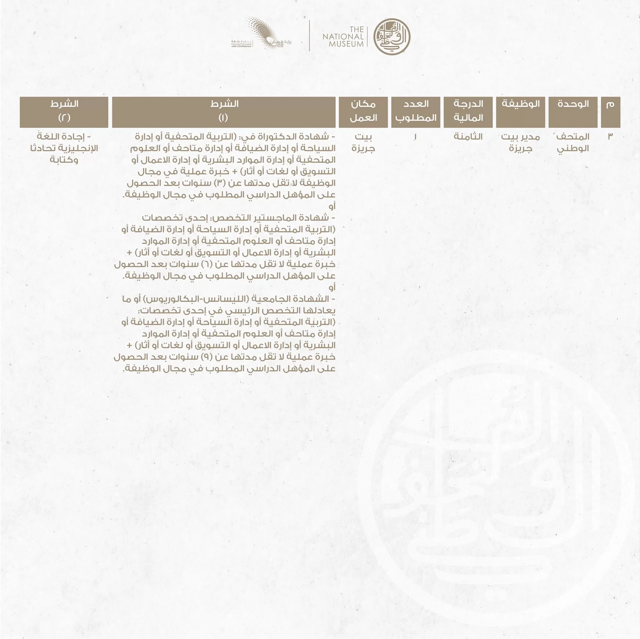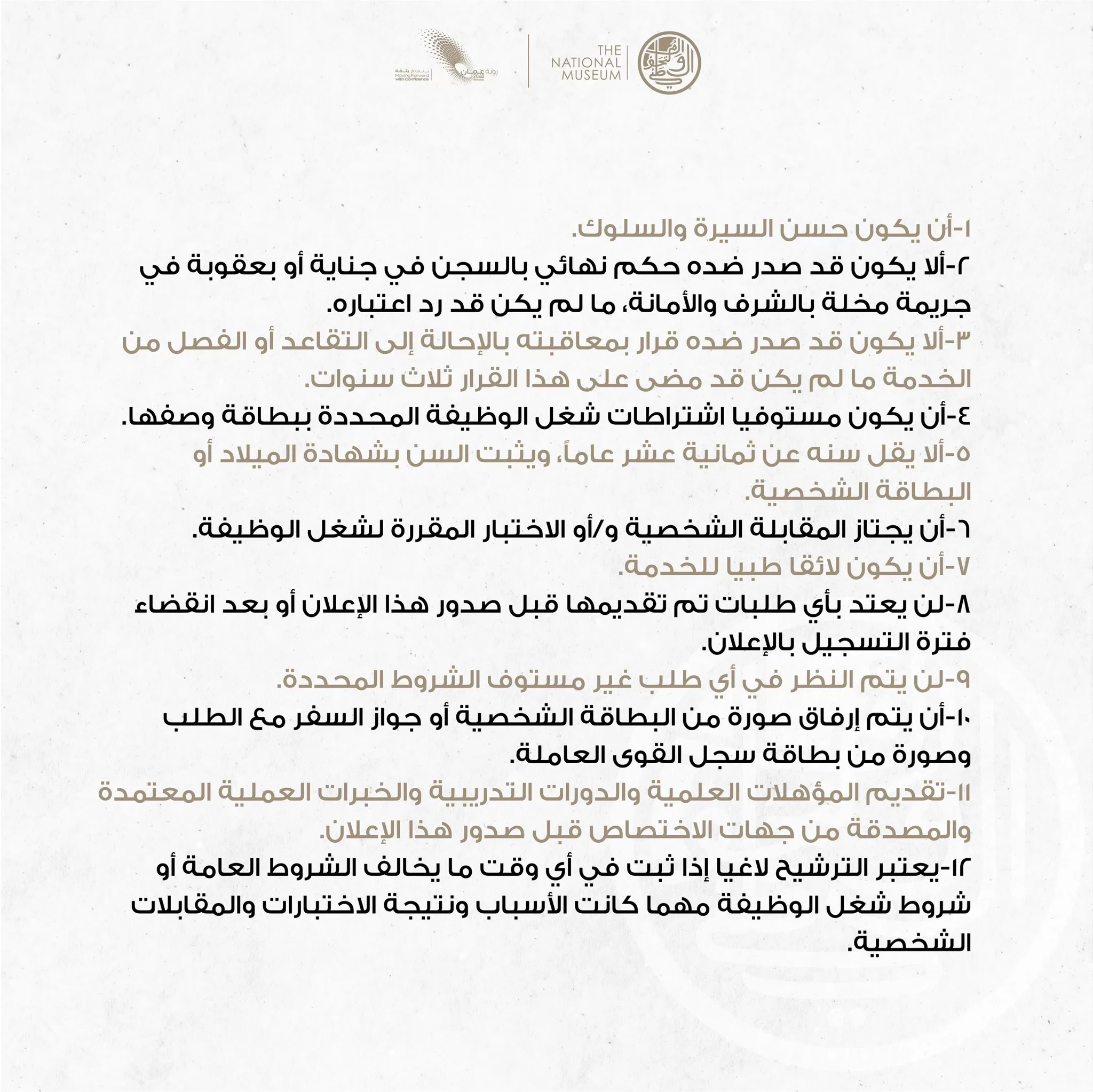 أعلن المتحف الوطني بسلطنة عمان عن وجود وظائف شاغرة، وذلك بالتعاون مع وزارة العمل، ويمكن لمن توافرت فيه الشروط التقدم بطلب بداية من يوم 21 أغسطس وحتى 4 سبتمبر.