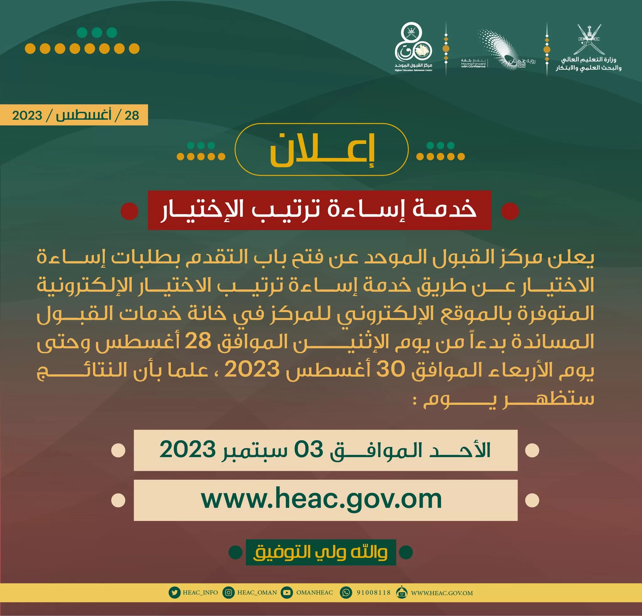 أعلن مركز القبول الموحد بدء خدمة إساءة ترتيب الاختيار من اليوم وحتى يوم الأربعاء الموافق 30 أغسطس 2023.