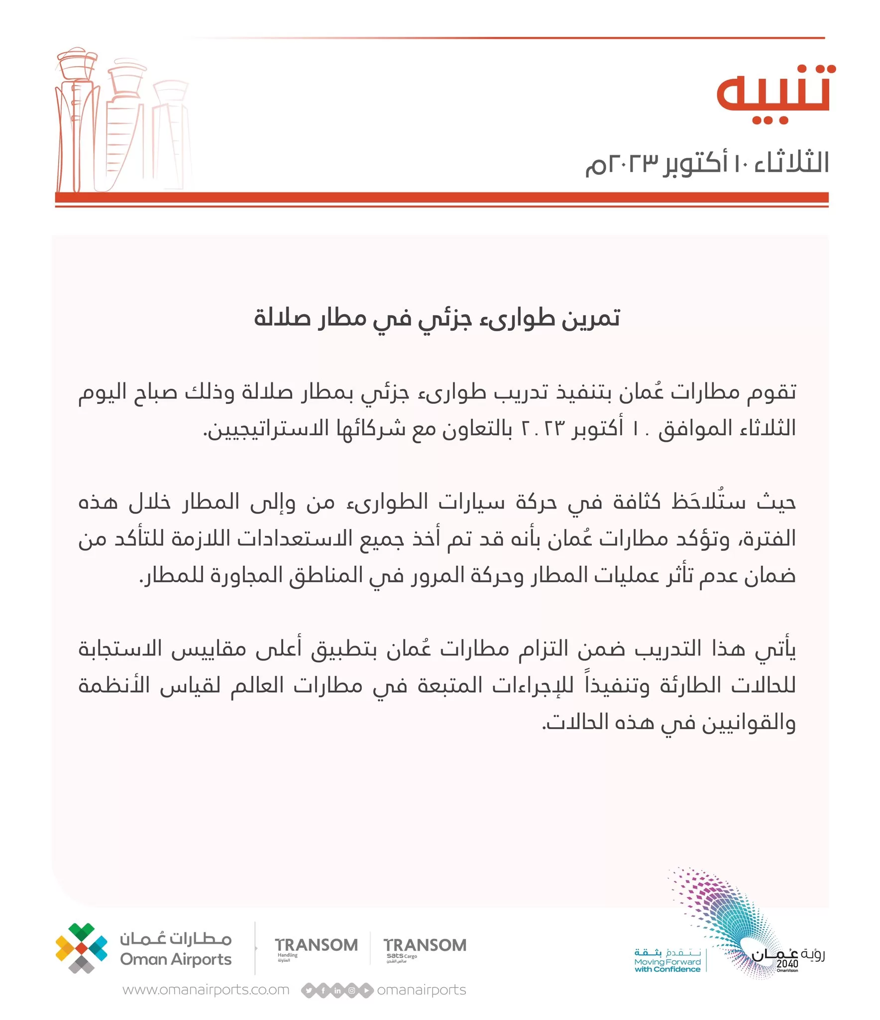 أعلنت مطارات عمان تنفيذ تدريب طوارئ جزئي في مطار صلالة، بالتعاون مع الشركاء الاستراتيجيين.