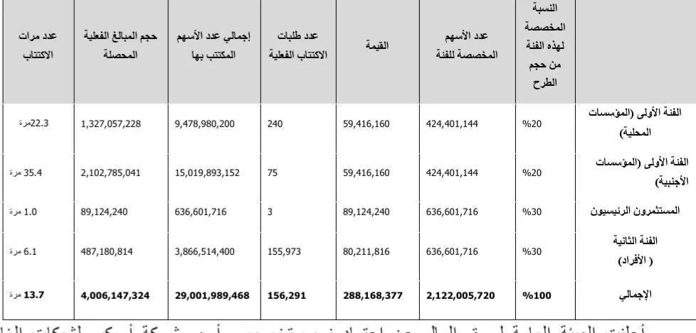 ويوضح الجدول التالي ملخص نتائج الاكتتاب حسب الفئات: