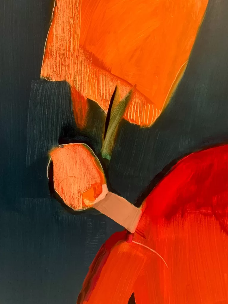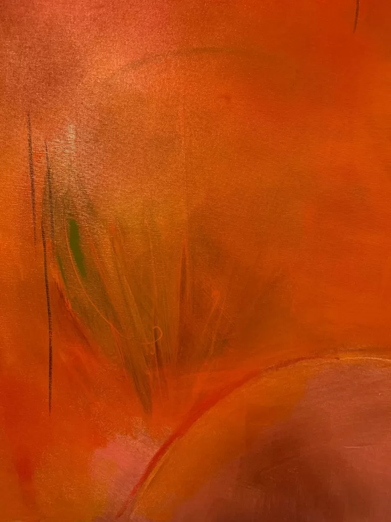 بالإضافة إلى ذلك الألوان في لوحات المعرض دافئة والبرتقالي هو اللون السائد فهو لون أرضي يدعو للتفاؤل وهو أحد ألوان شمسنا الجميلة، كذلك تحمل اللوحات عناوين متنوعة منها: حزن المساء، أنا أولاً، لقد بذلت قصارى جهدي، الجنة والأرض في داخلي، حصاد، عندليب جريح، وغيرها..