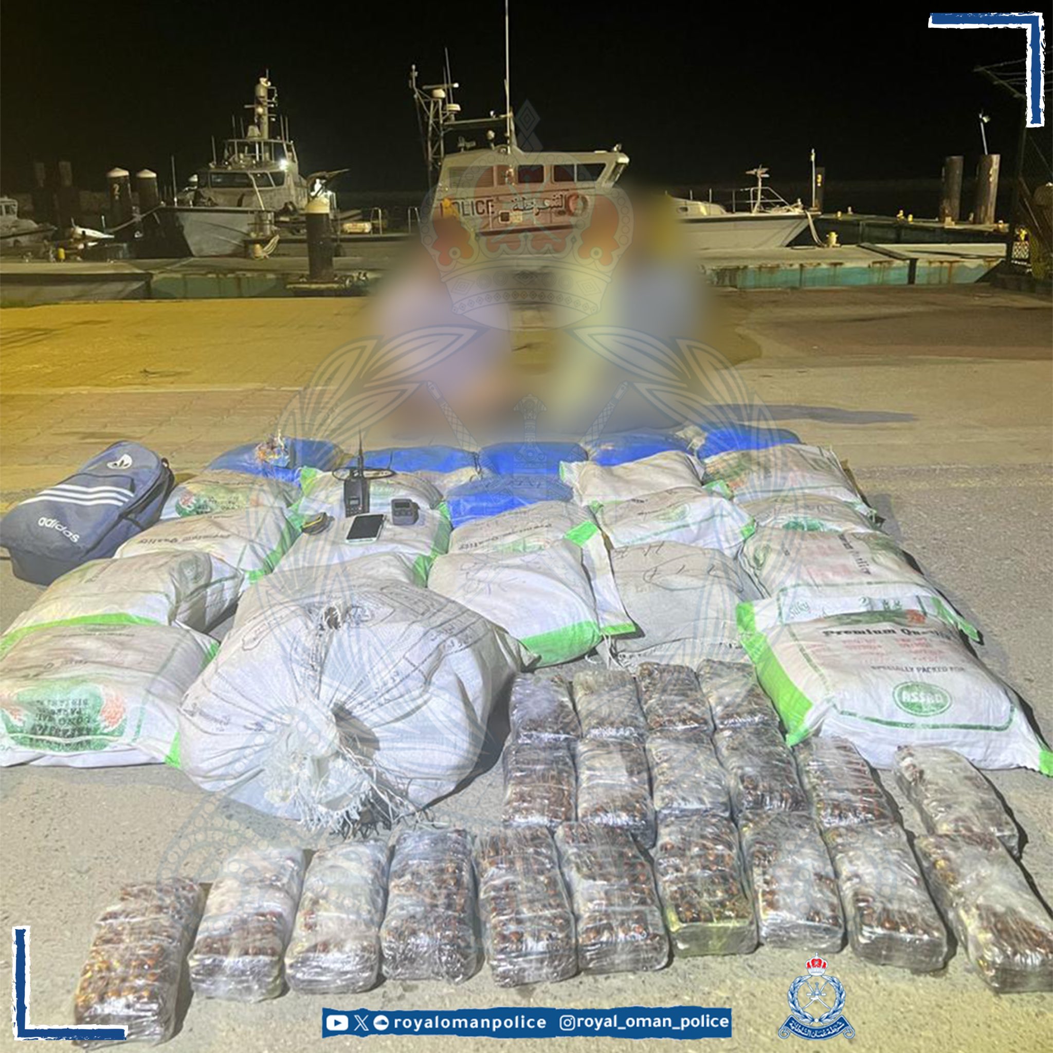 ضبطت شرطة خفر السواحل بمحافظة شمال الباطنة قاربًا على متنه شخصين وبحوزتهما أربعين ألف قرص من المؤثرات العقلية و ٢٣٢ كيلوجرامًا من مخدر الحشيش، وتُستكمل الإجراءات القانونية بحقهما.