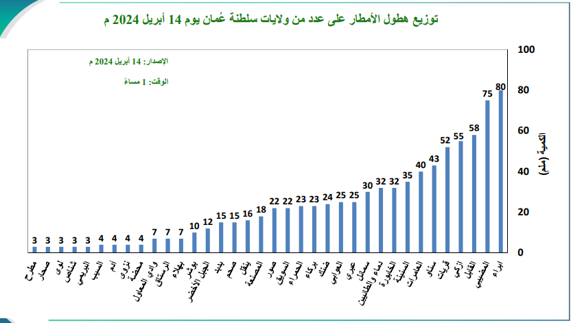وأشارت بيانات توزيع هطول الأمطار أن أعلى كمية هطول أمطار سجلت في ولاية إبراء بمعدل (80) ملم، تليها ولاية المضيبي بمعدل (75) ملم، وجاءت بعدها ولاية القابل (58) ملم ثم ولاية إزكي (55) ملم ثم ولاية قريات بمعدل (52) ملم ثم ولاية سناو (43) ملم، وولاية العامرات (40) ملم وولاية السنينة (35) ملم.
