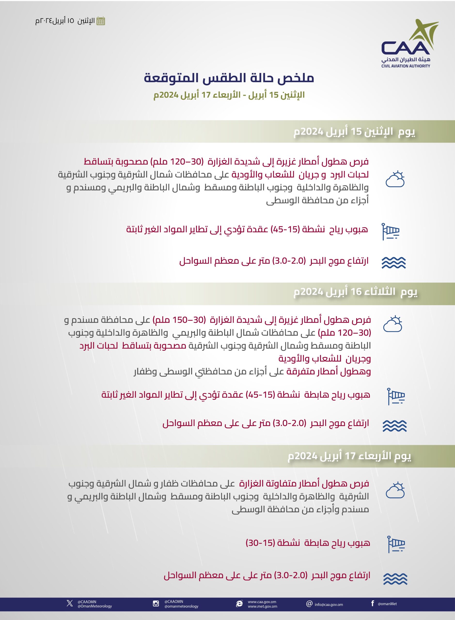 نشرت هيئة الطيران المدني ملخصا لحالة الطقس المتوقعة من (15-17 أبريل 2024م).