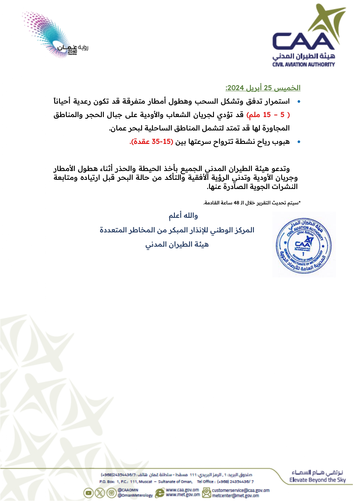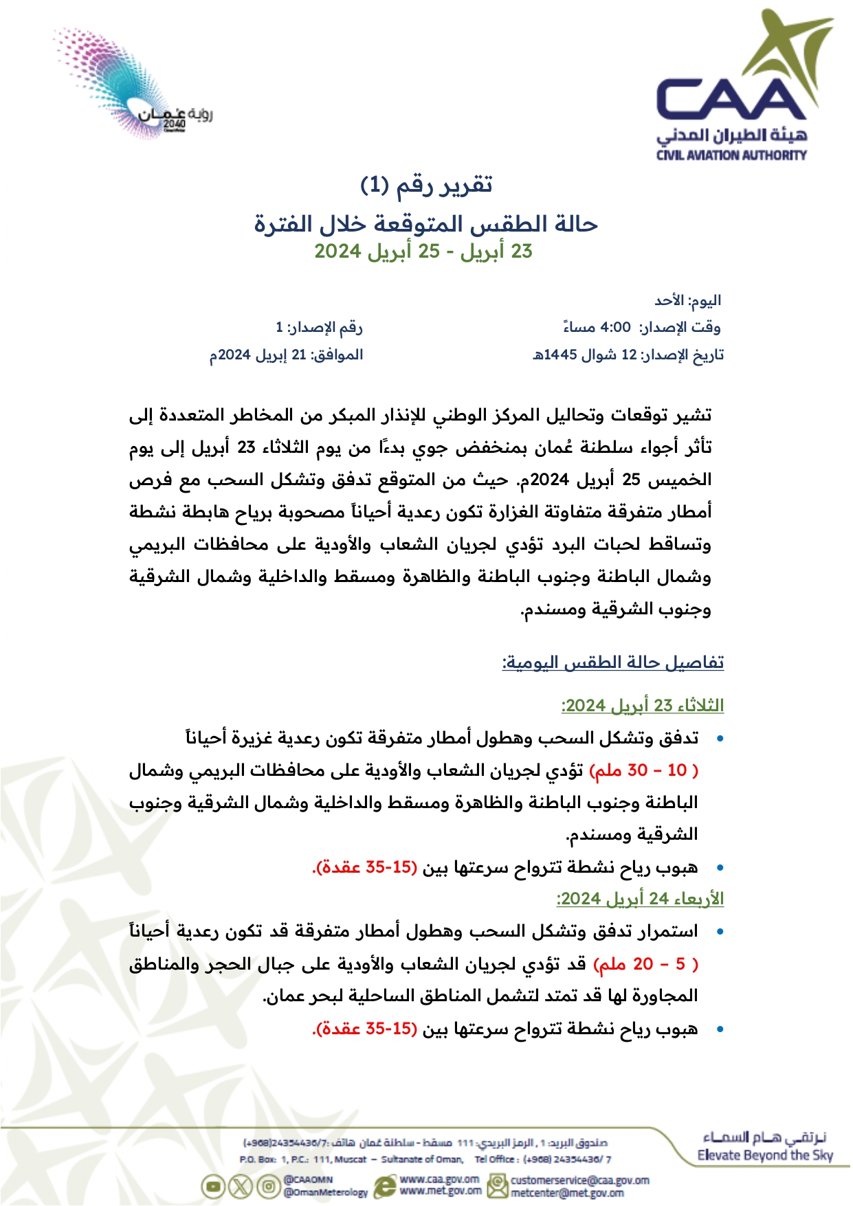 أصدرت هيئة الأرصاد التقرير رقم (1) عن تأثر أجواء سلطنة عمان بمنخفض جوي خلال الأيام المقبلة.